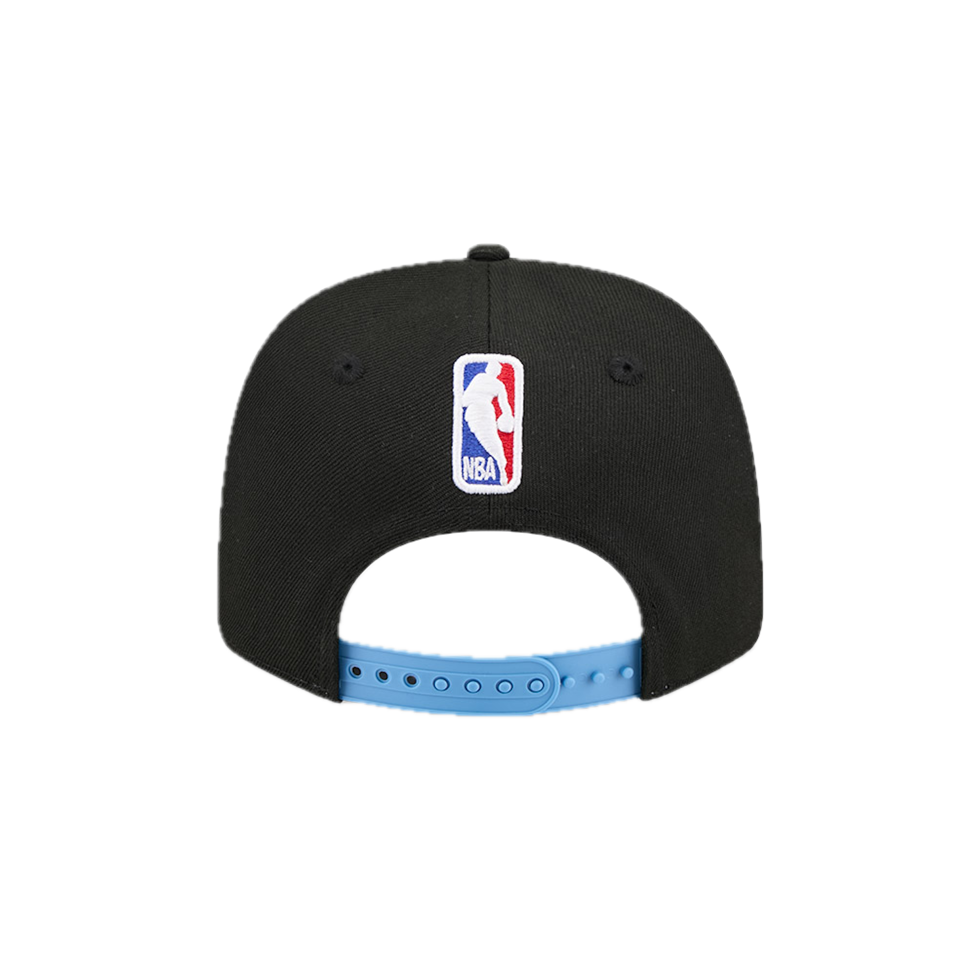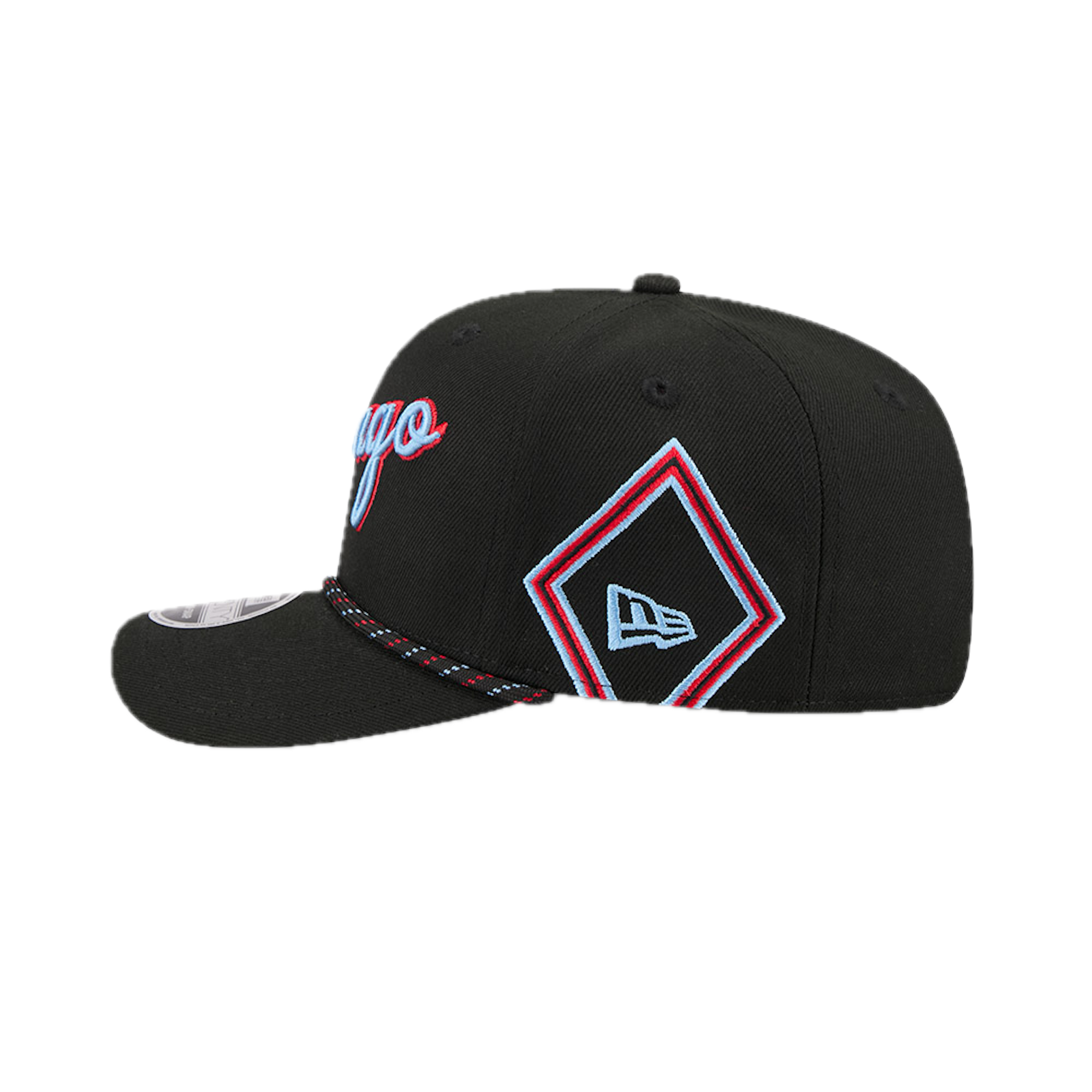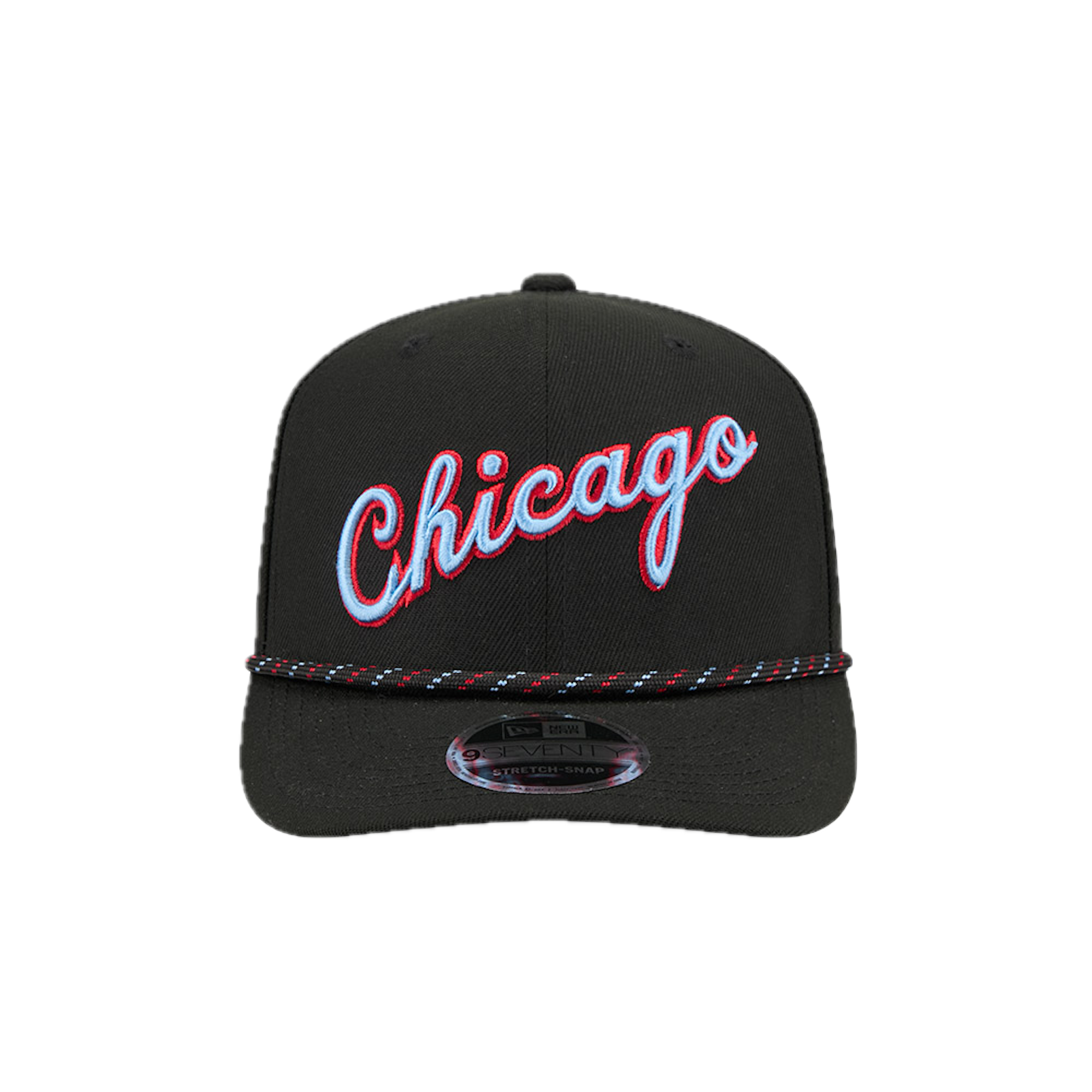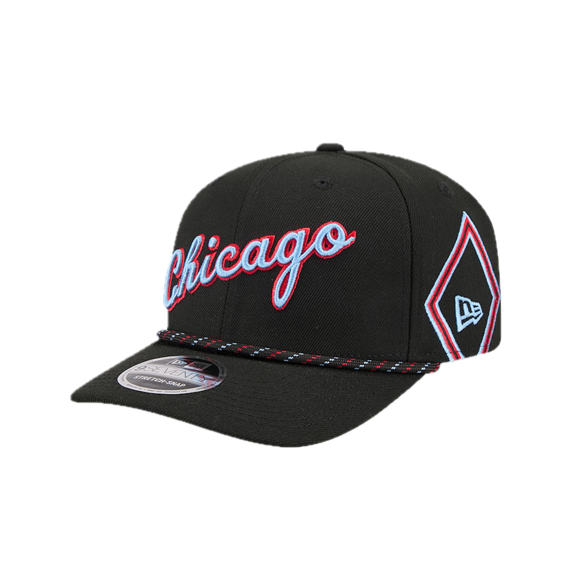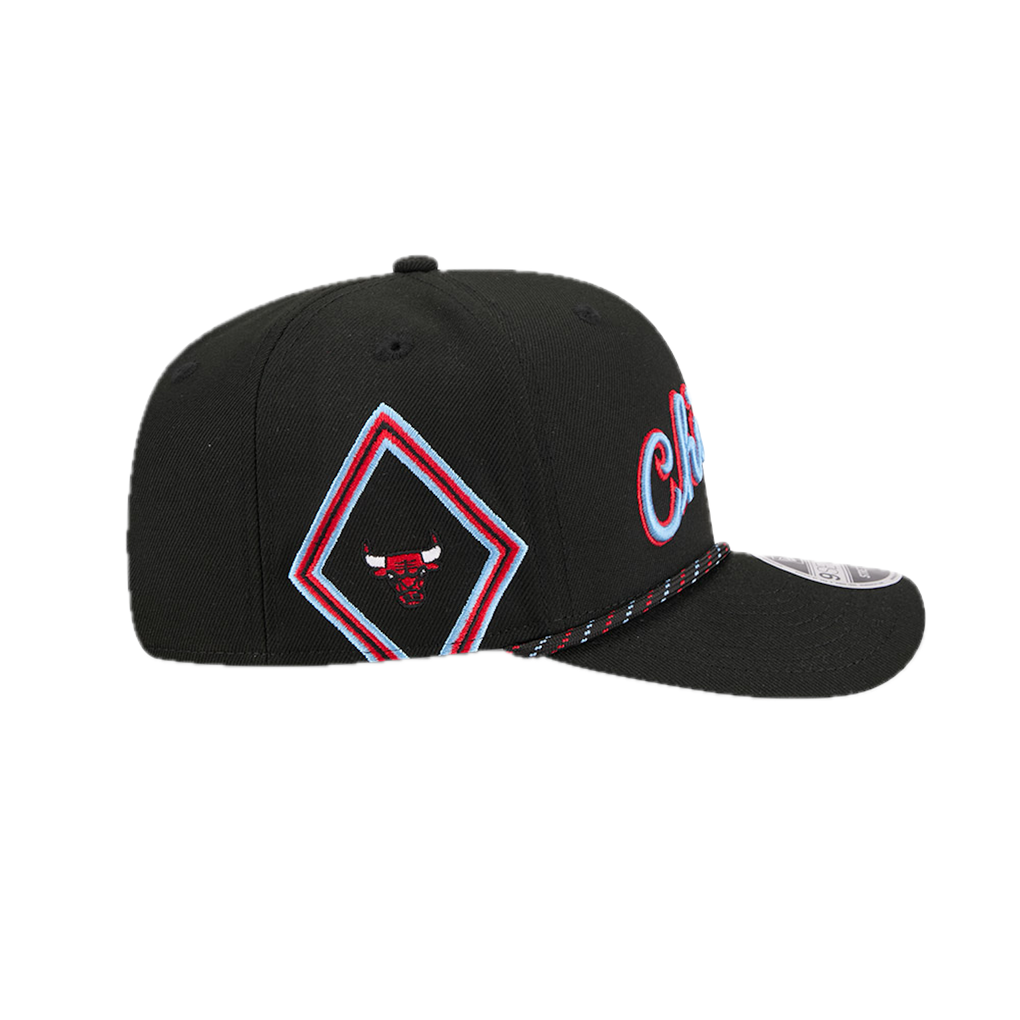 The Chicago Bulls 2025 City Edition 9SEVENTY Stretch-Snap features an embroidered Bulls City Edition logo at the front panels with a logo at the right-wear side and a rope at the visor. Additional details include the NBA Logoman above an adjustable stretch-snap closure at the rear and a gray undervisor.