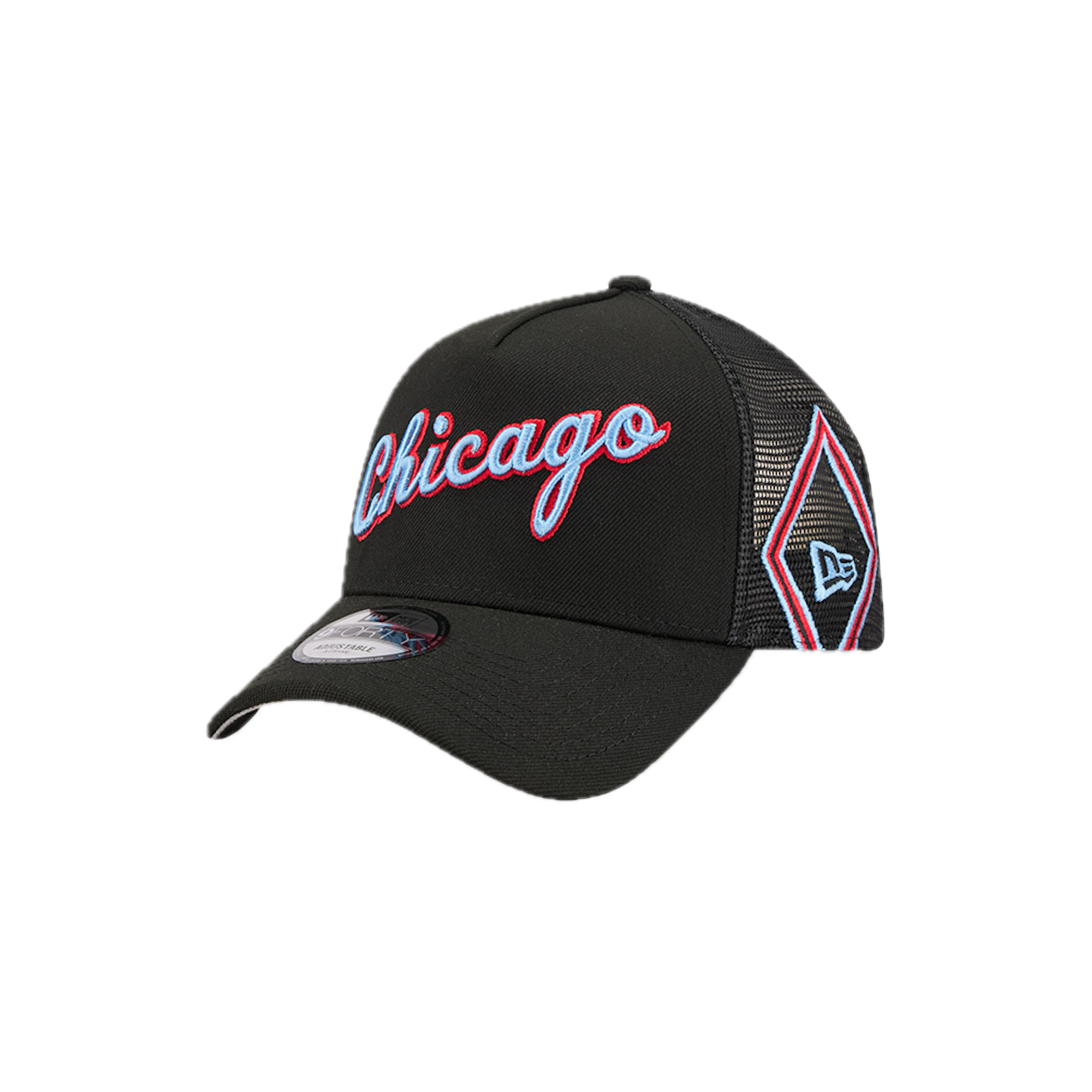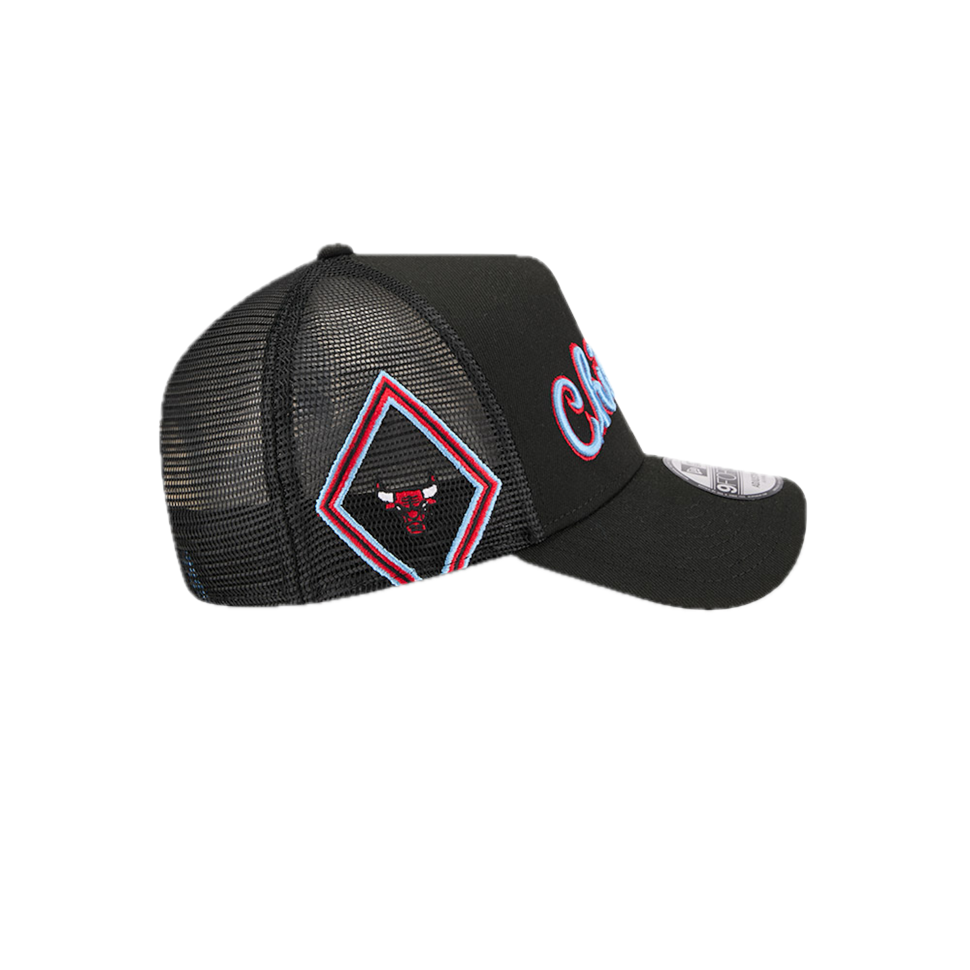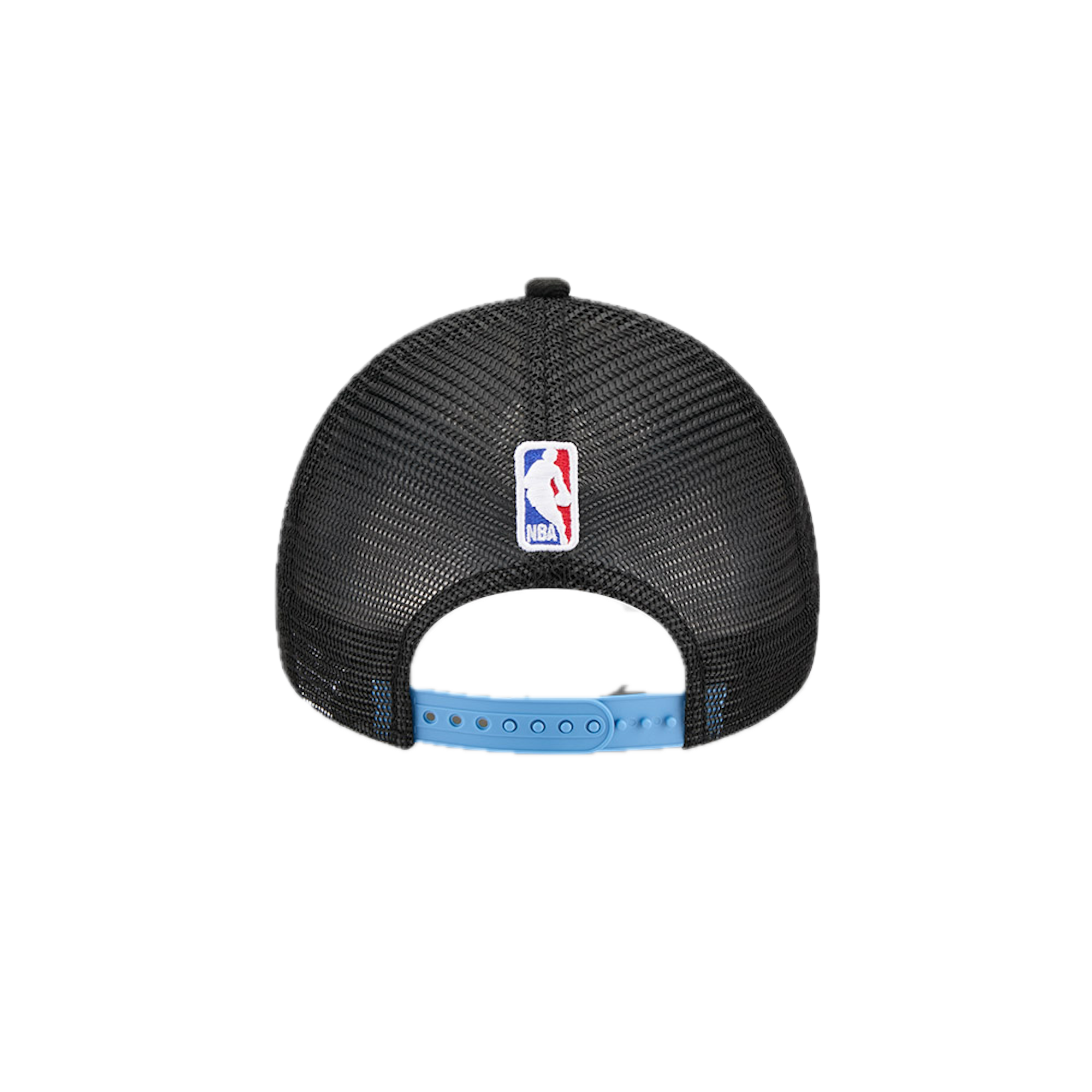 The Boston Celtics NBA City Edition '25 9FORTY A-Frame Trucker features an embroidered flat City Edition Celtics logo on high-profile pinched cotton front panels, tonal polyester mesh side and back panels with a contrast visor, team logo patch detail on the side, and an league logo at the back above an adjustable snapback enclosure.