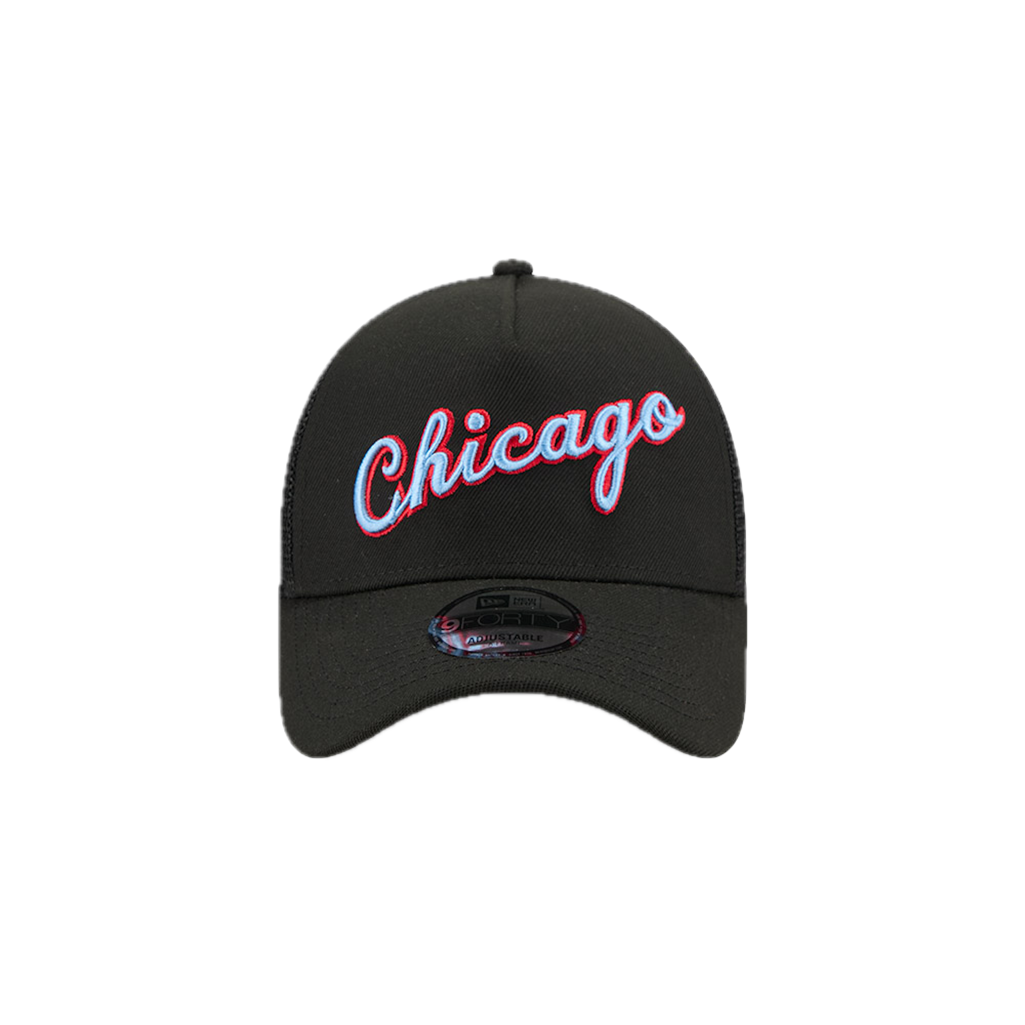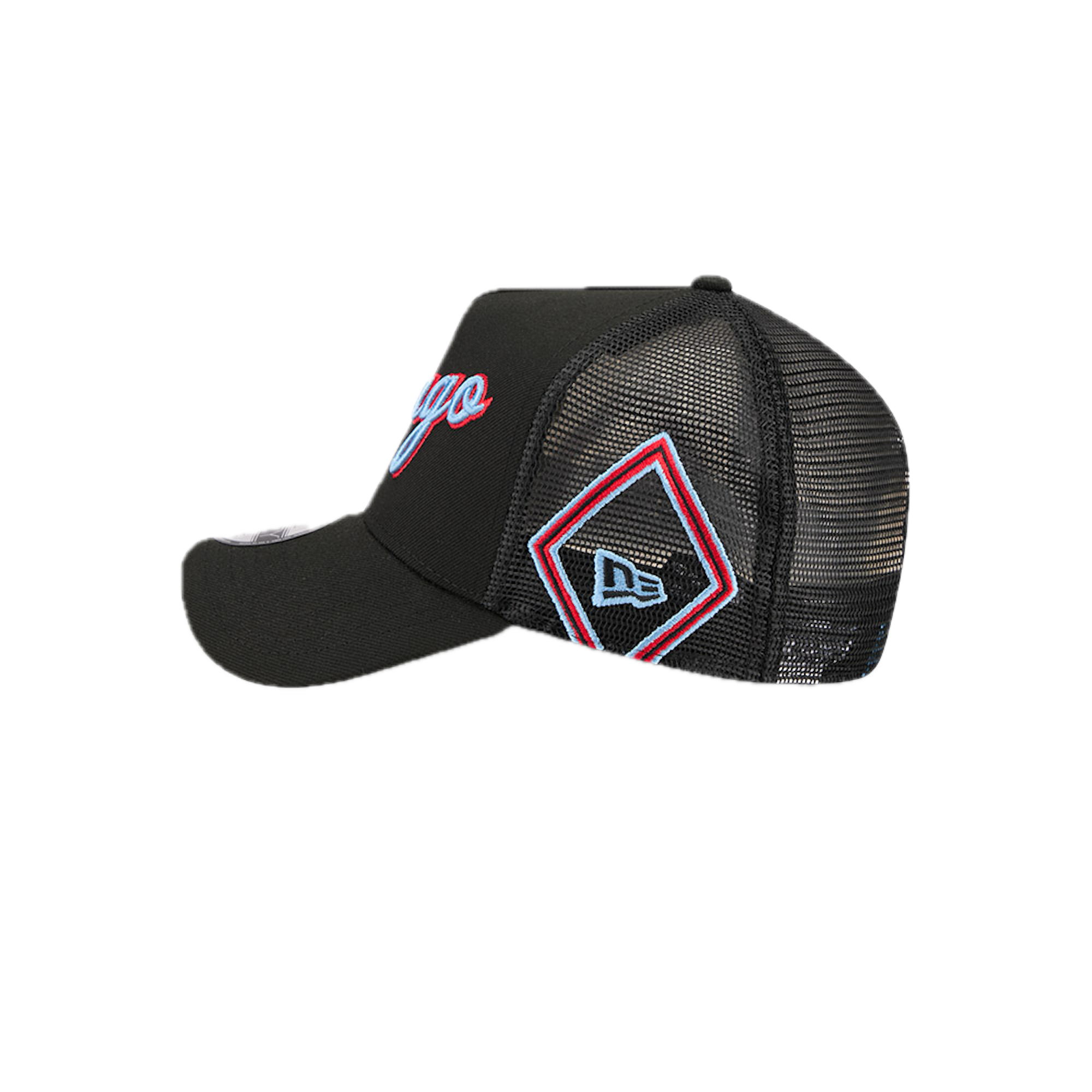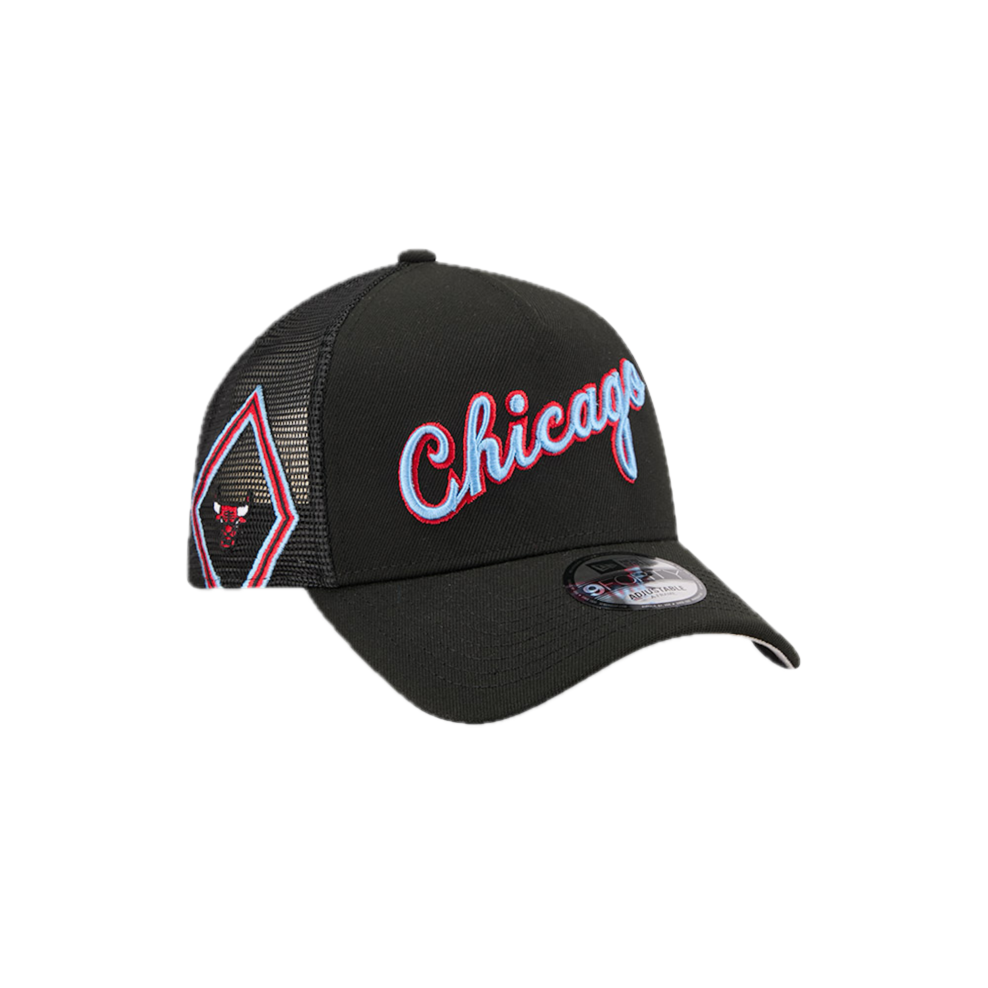 The Boston Celtics NBA City Edition '25 9FORTY A-Frame Trucker features an embroidered flat City Edition Celtics logo on high-profile pinched cotton front panels, tonal polyester mesh side and back panels with a contrast visor, team logo patch detail on the side, and an league logo at the back above an adjustable snapback enclosure.