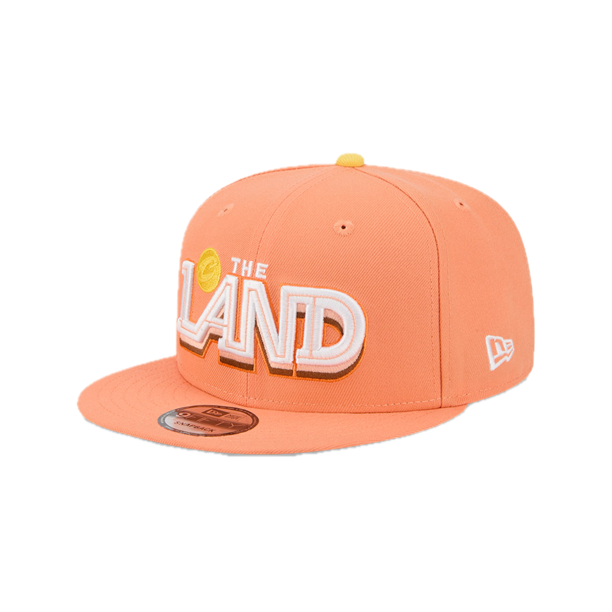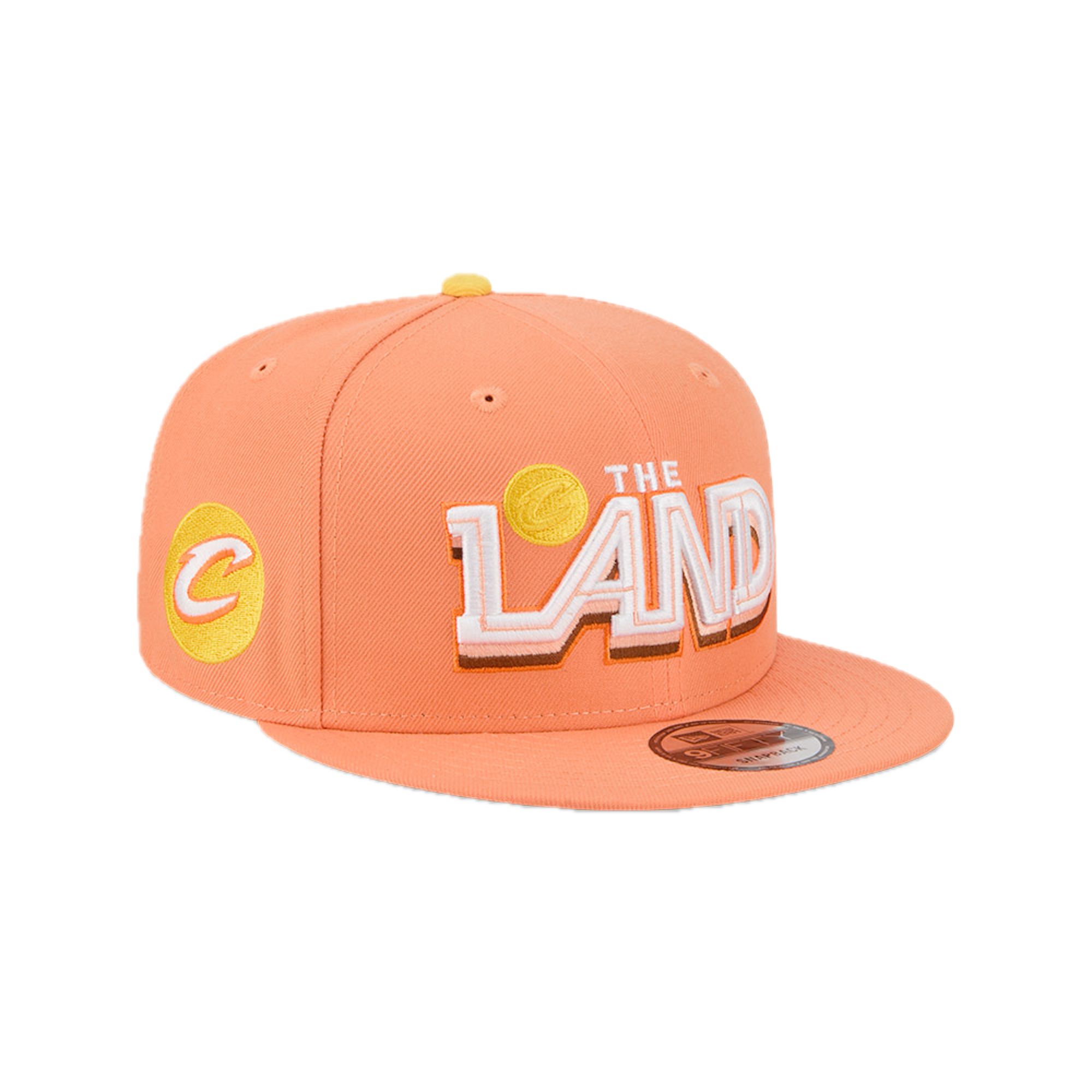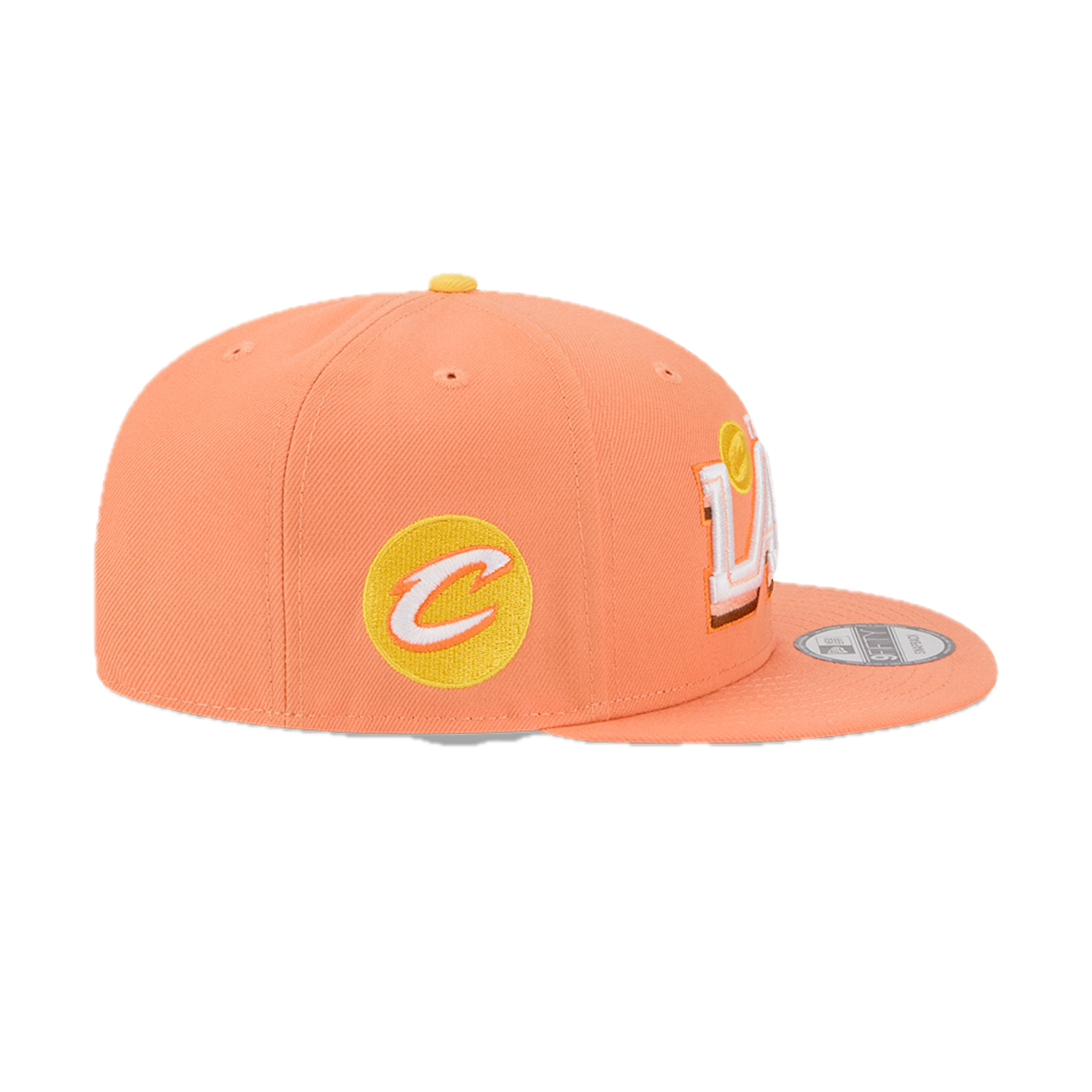 This New Era 9FIFTY Cleveland Cavaliers flat cap from the 2025 NBA City Edition features the Cavaliers' city name embroidered on the front panels, the team logo on the right side, the NBA logo on the back, and the New Era flag embroidered on the left side.