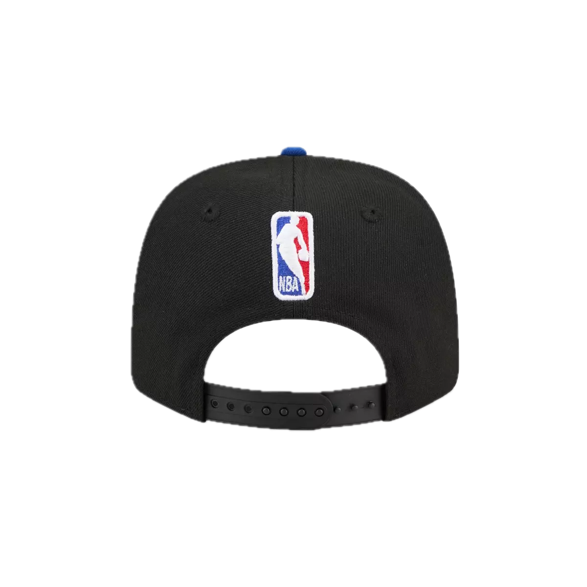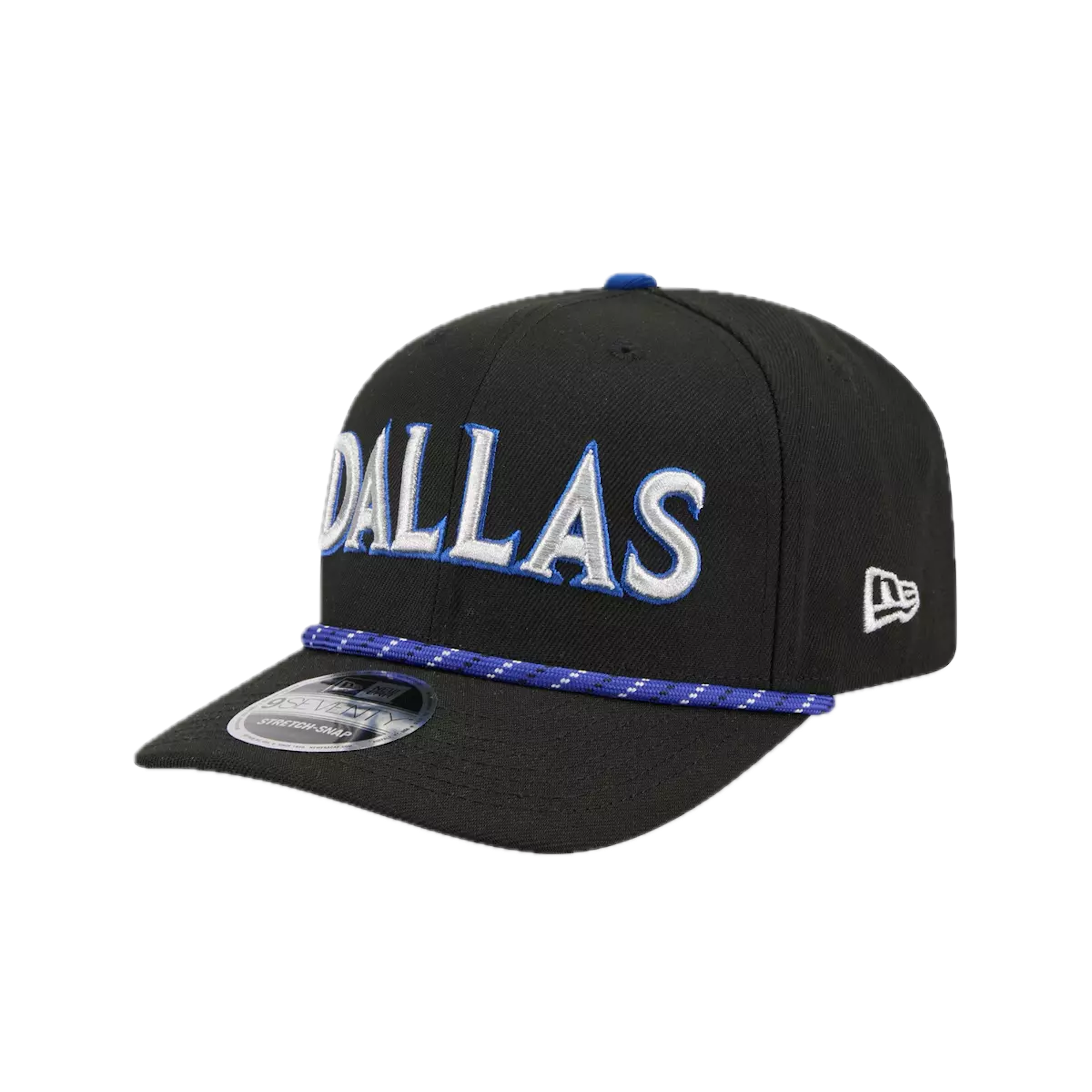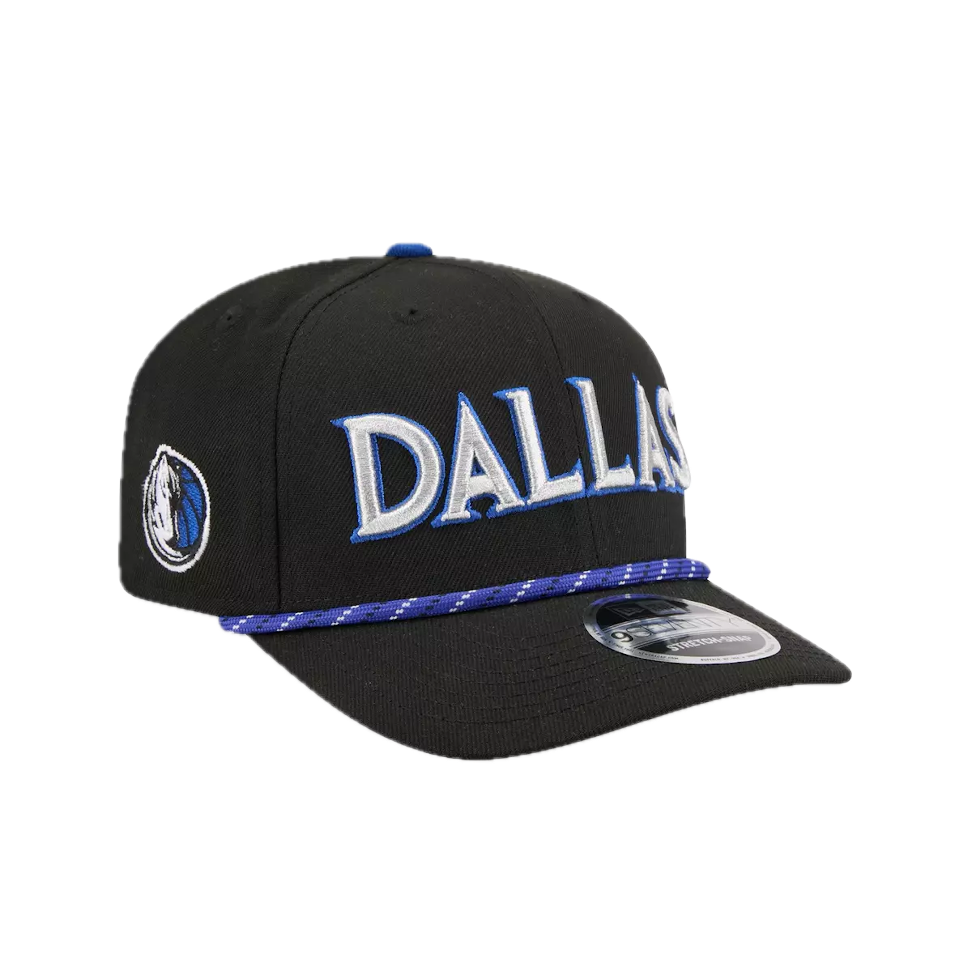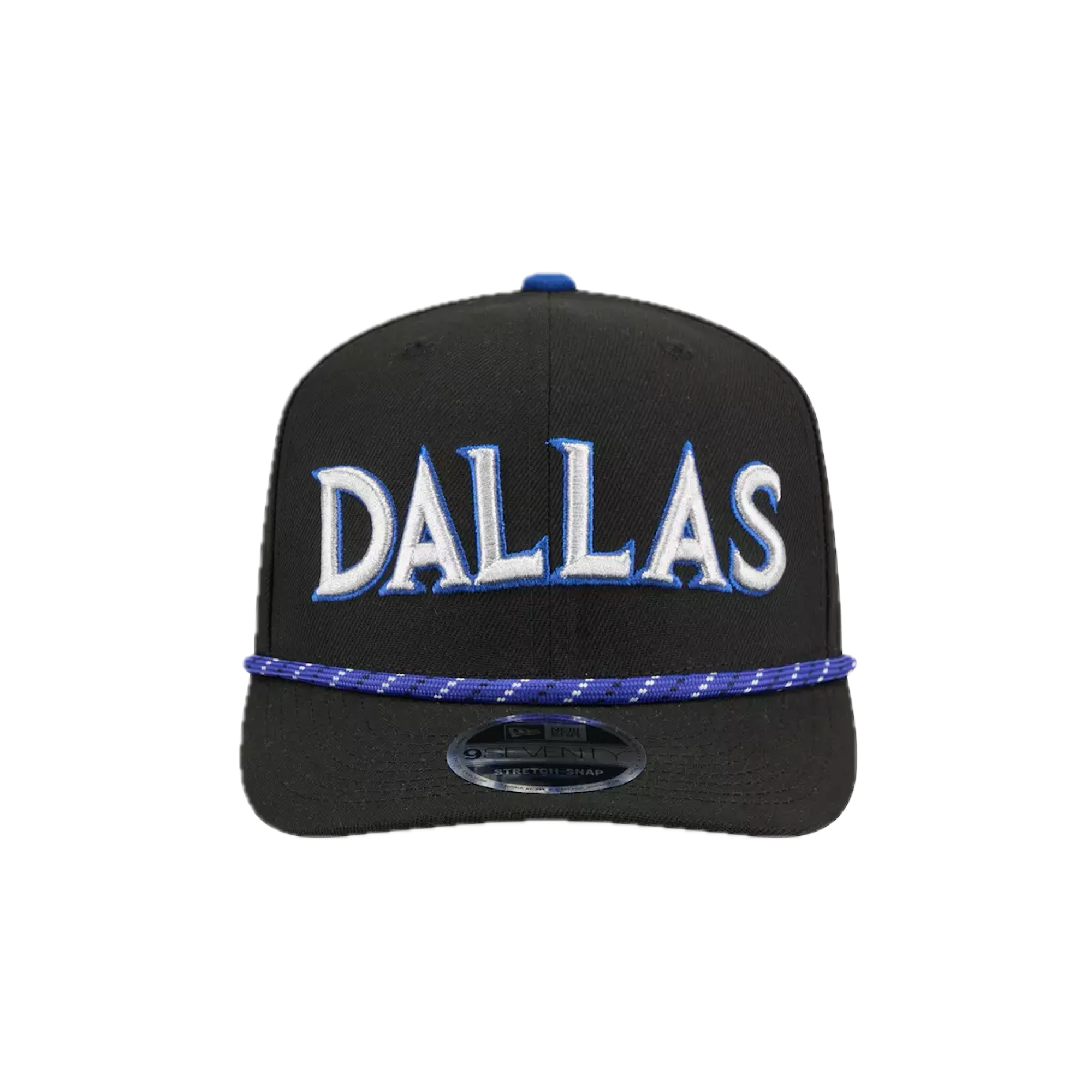 The Dallas Mavericks 2025 City Edition 9SEVENTY Stretch-Snap features an embroidered Mavericks City Edition logo at the front panels with a logo at the right-wear side and a rope at the visor. Additional details include the NBA Logoman above an adjustable stretch-snap closure at the rear and a gray undervisor.