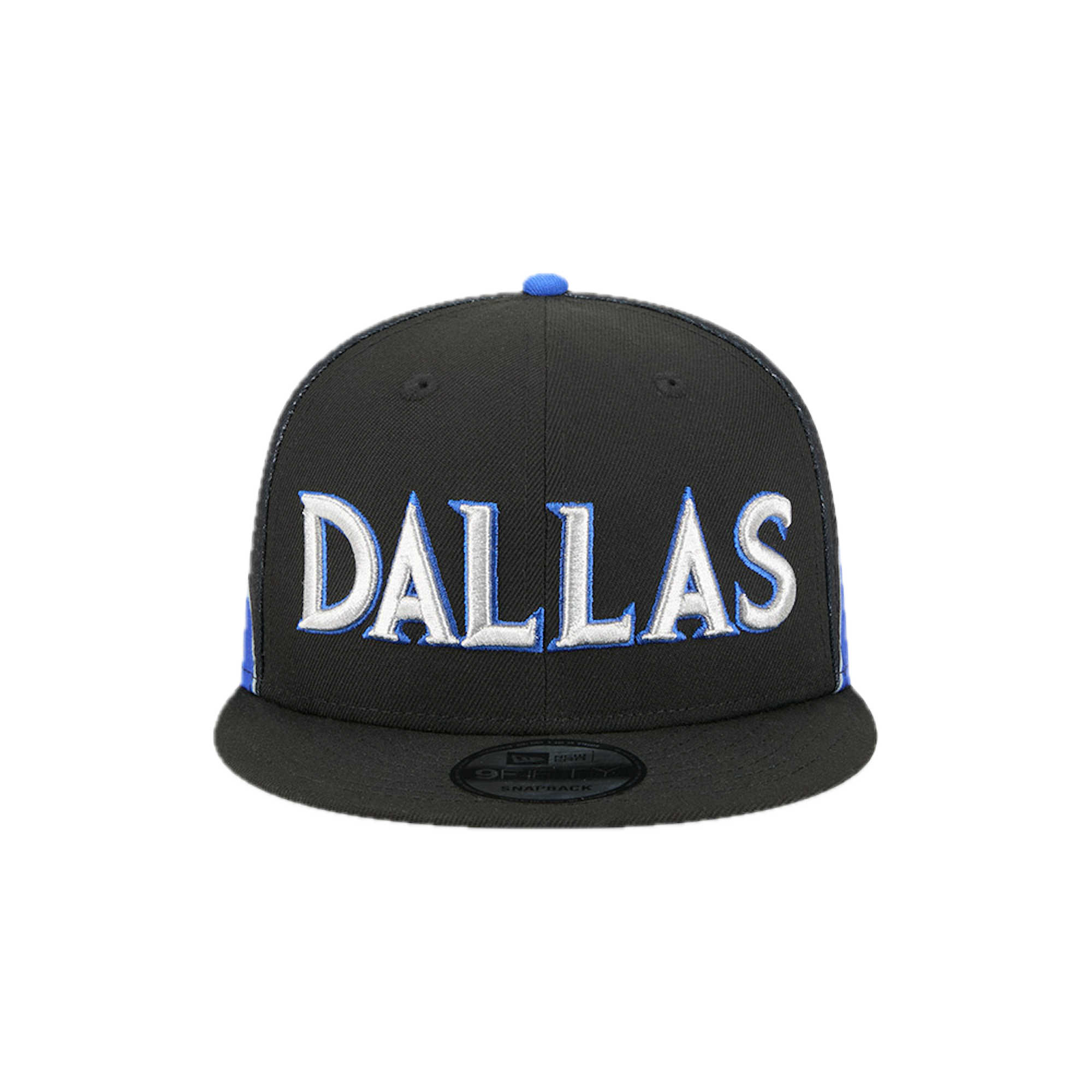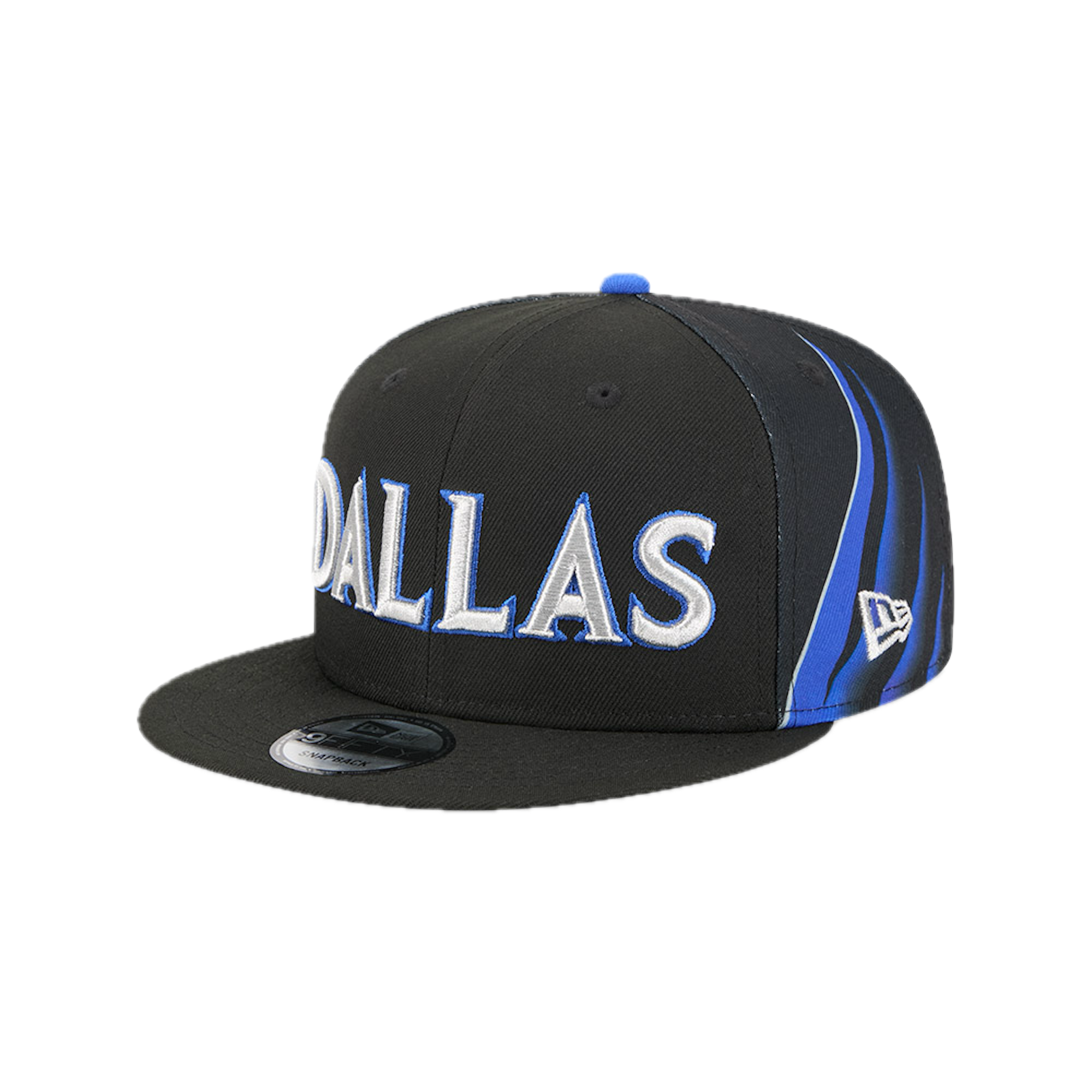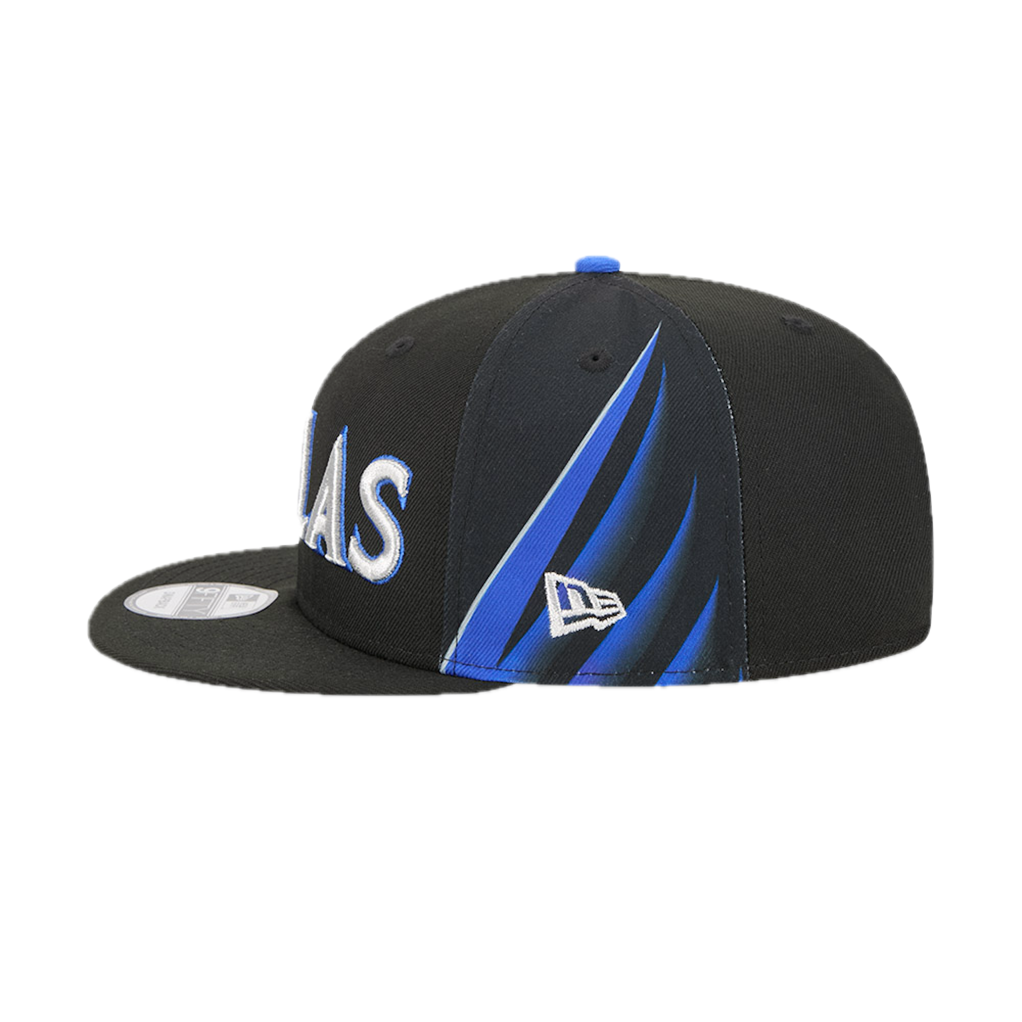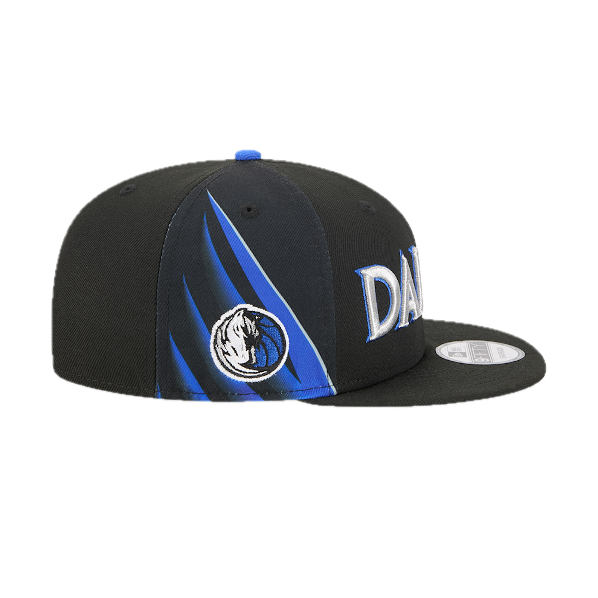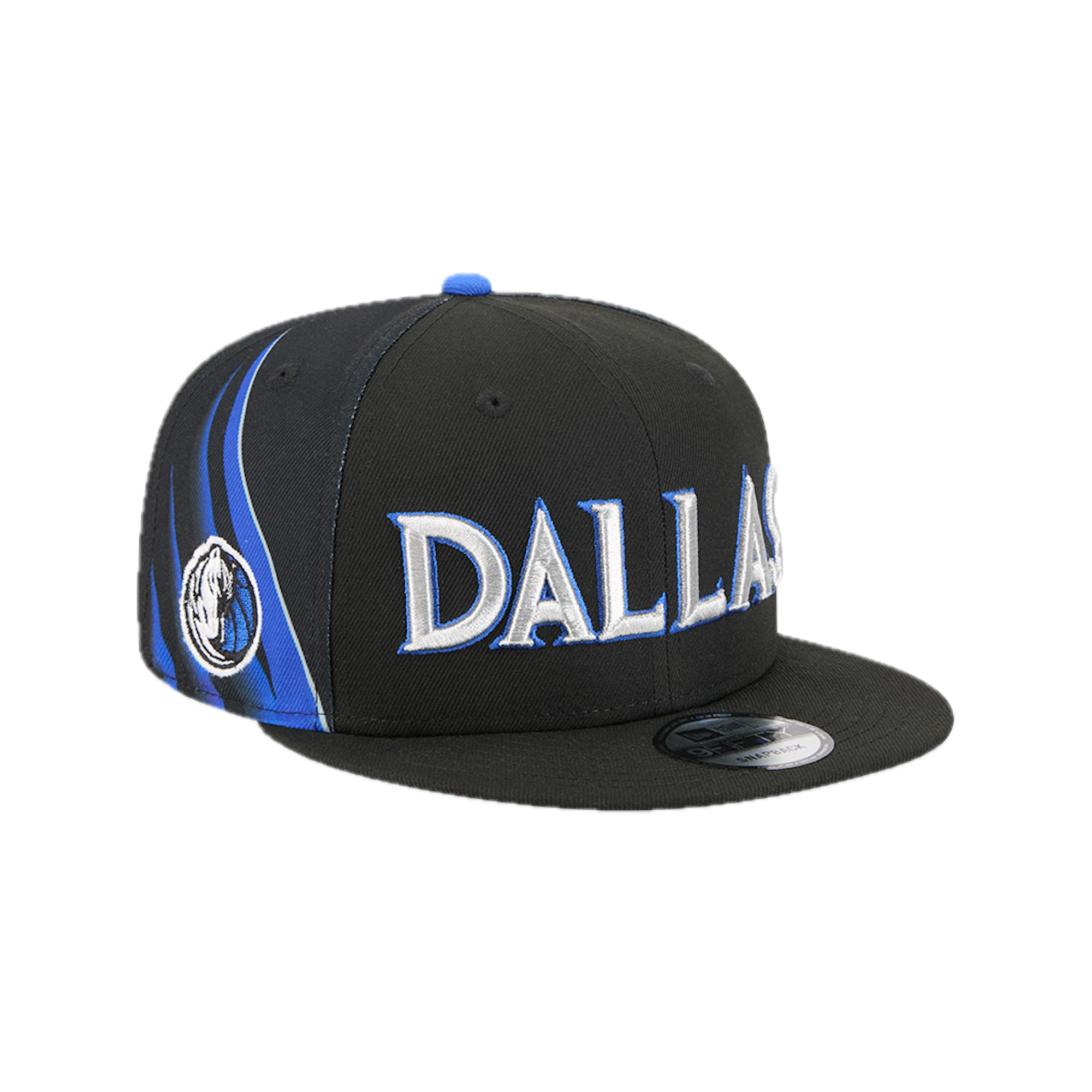 This New Era 9FIFTY Dallas Mavericks flat cap from the 2025 NBA City Edition features the Mavericks' city name embroidered on the front panels, the team logo on the right side, the NBA logo on the back, and the New Era flag embroidered on the left side.