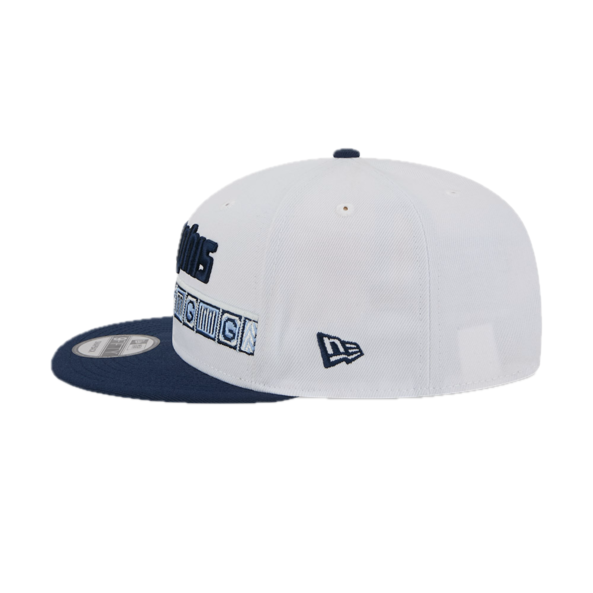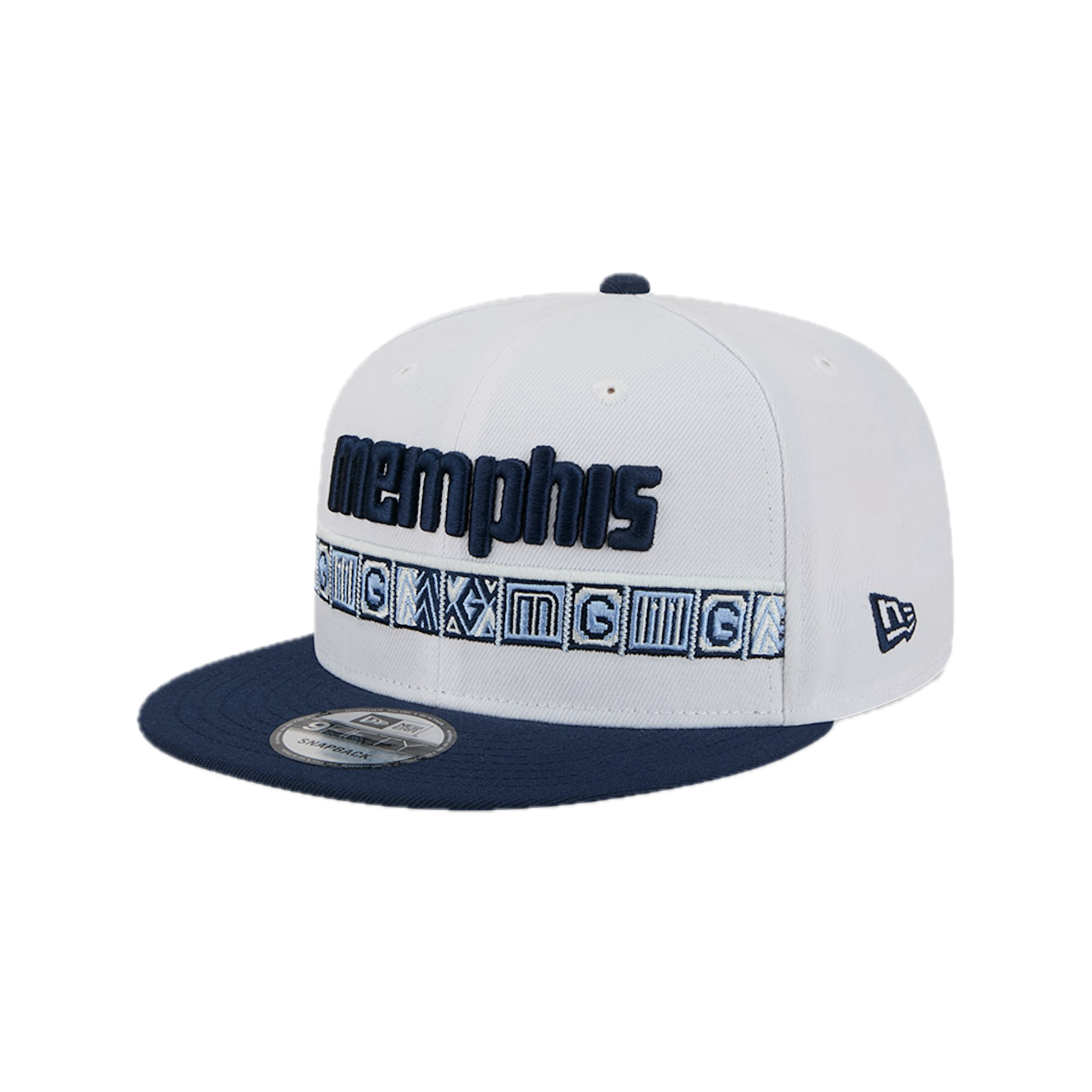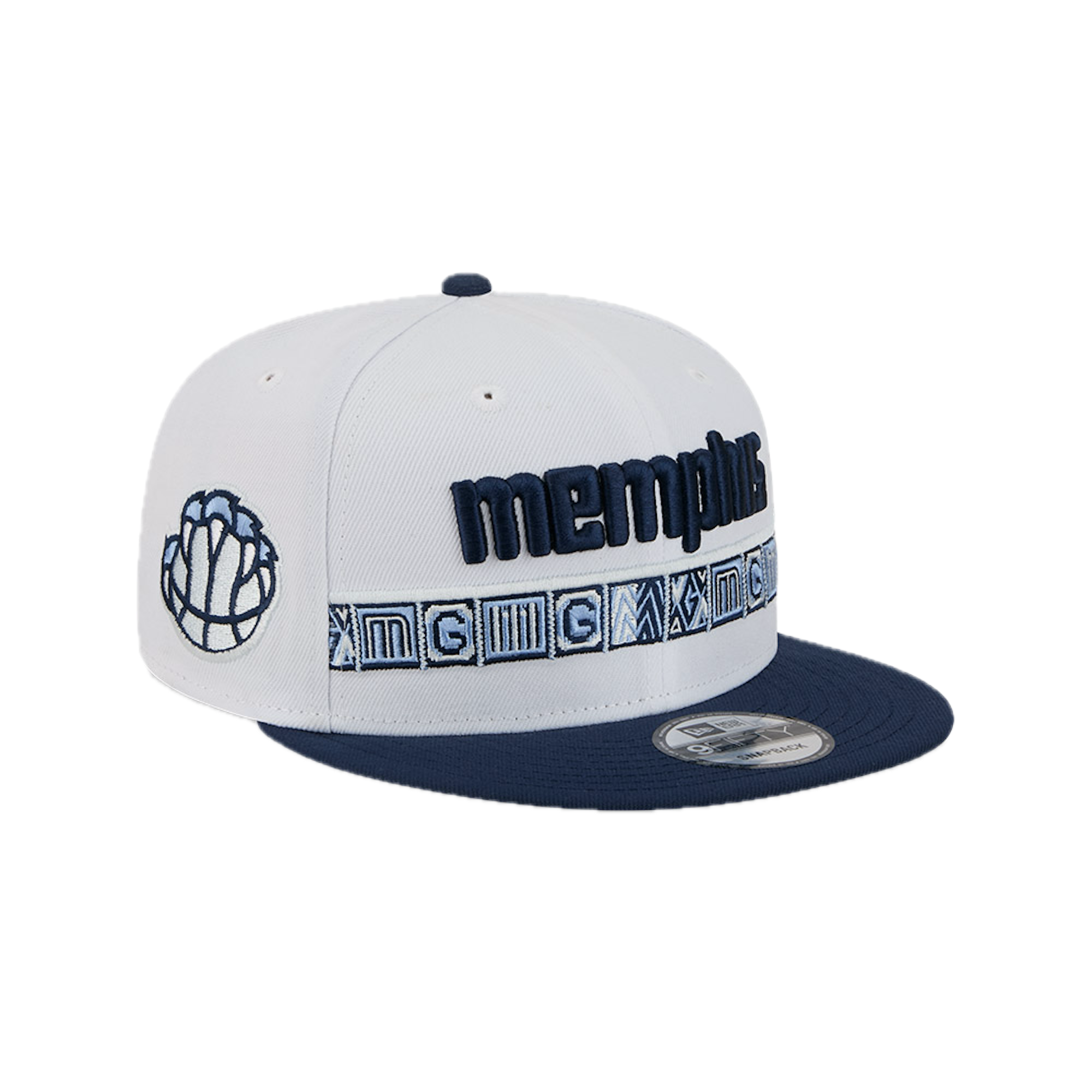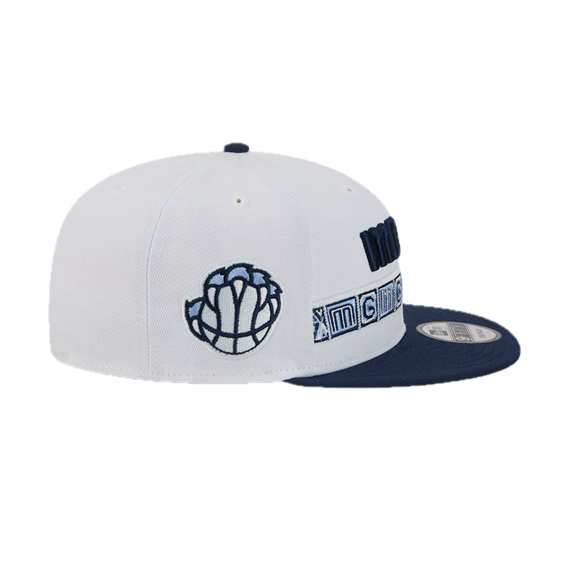 This New Era 9FIFTY Memphis Grizzlies flat cap from the 2025 NBA City Edition collection features the Grizzlies' city name embroidered on the front panels, the team logo on the right side, the NBA logo on the back, and the New Era flag embroidered on the left side