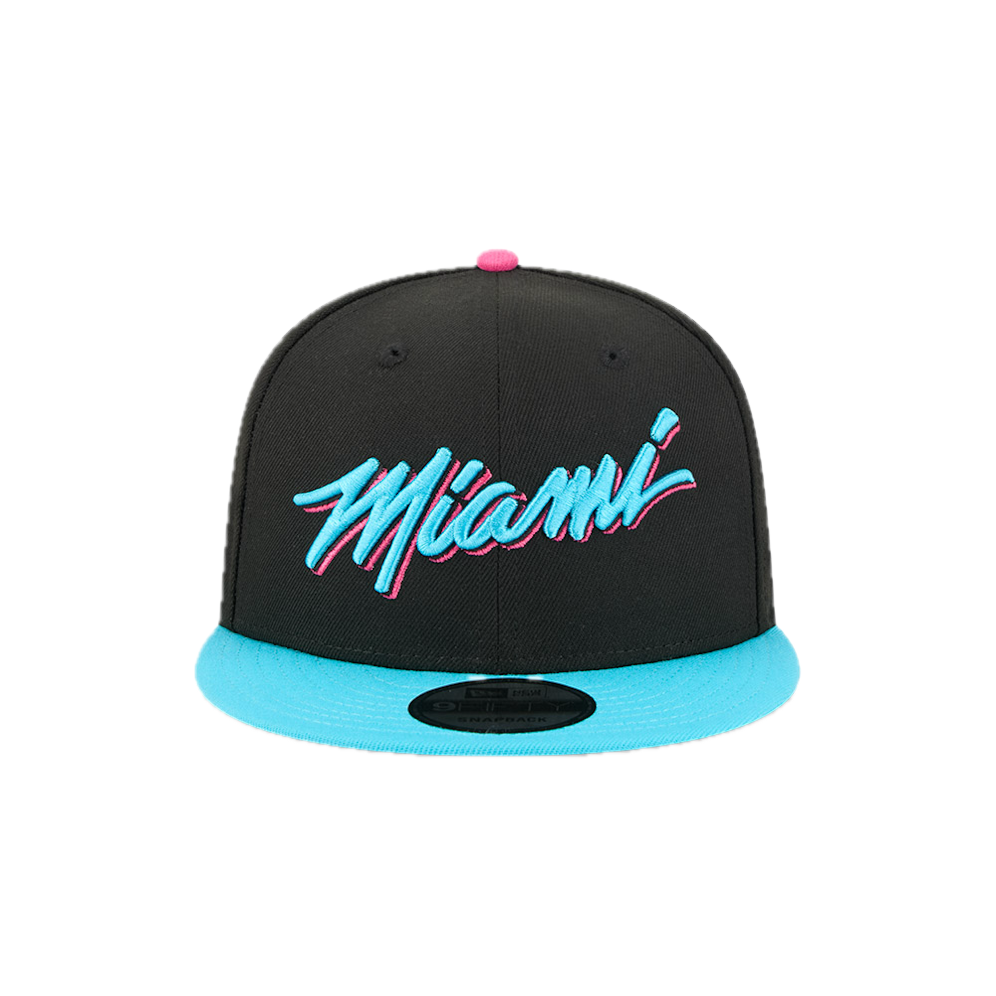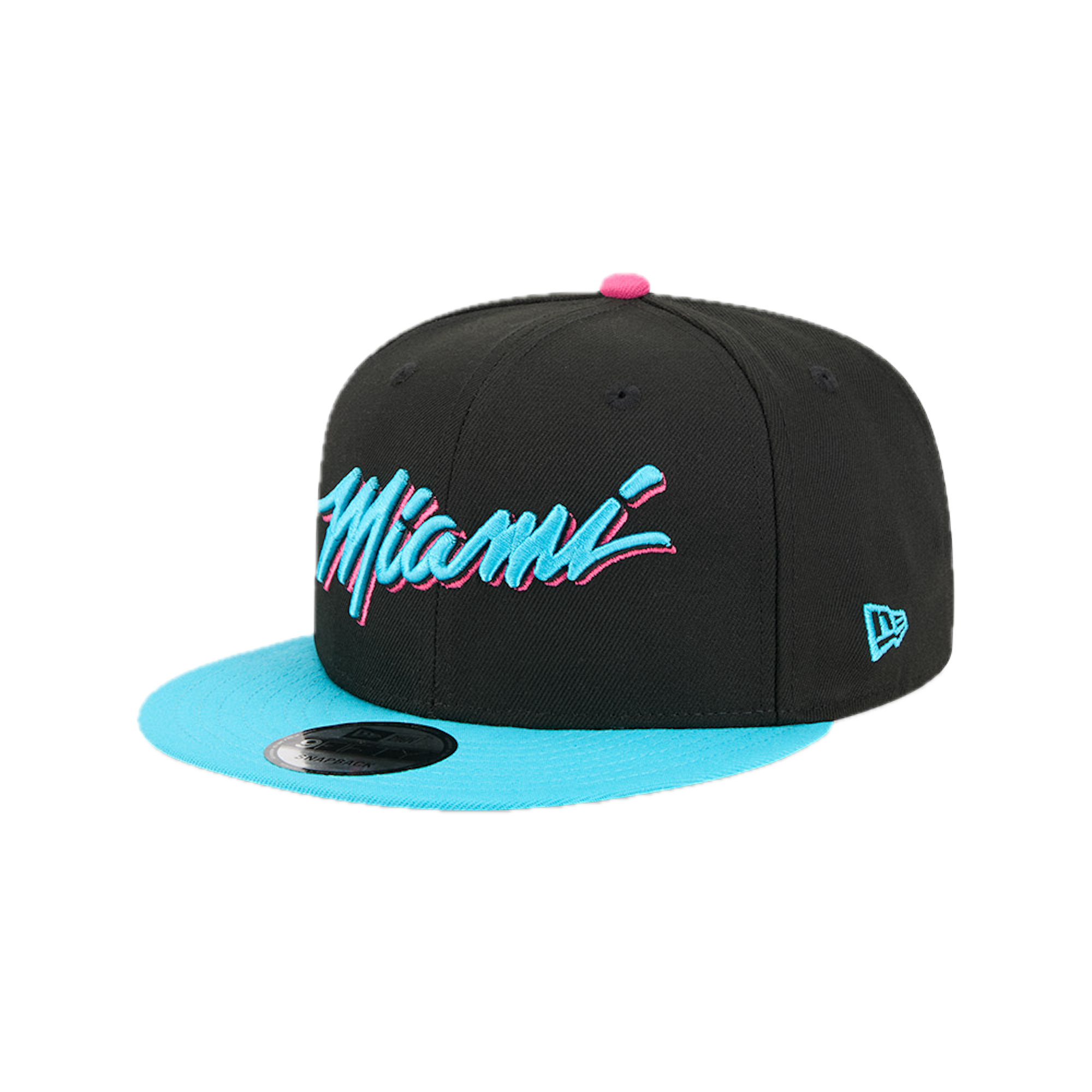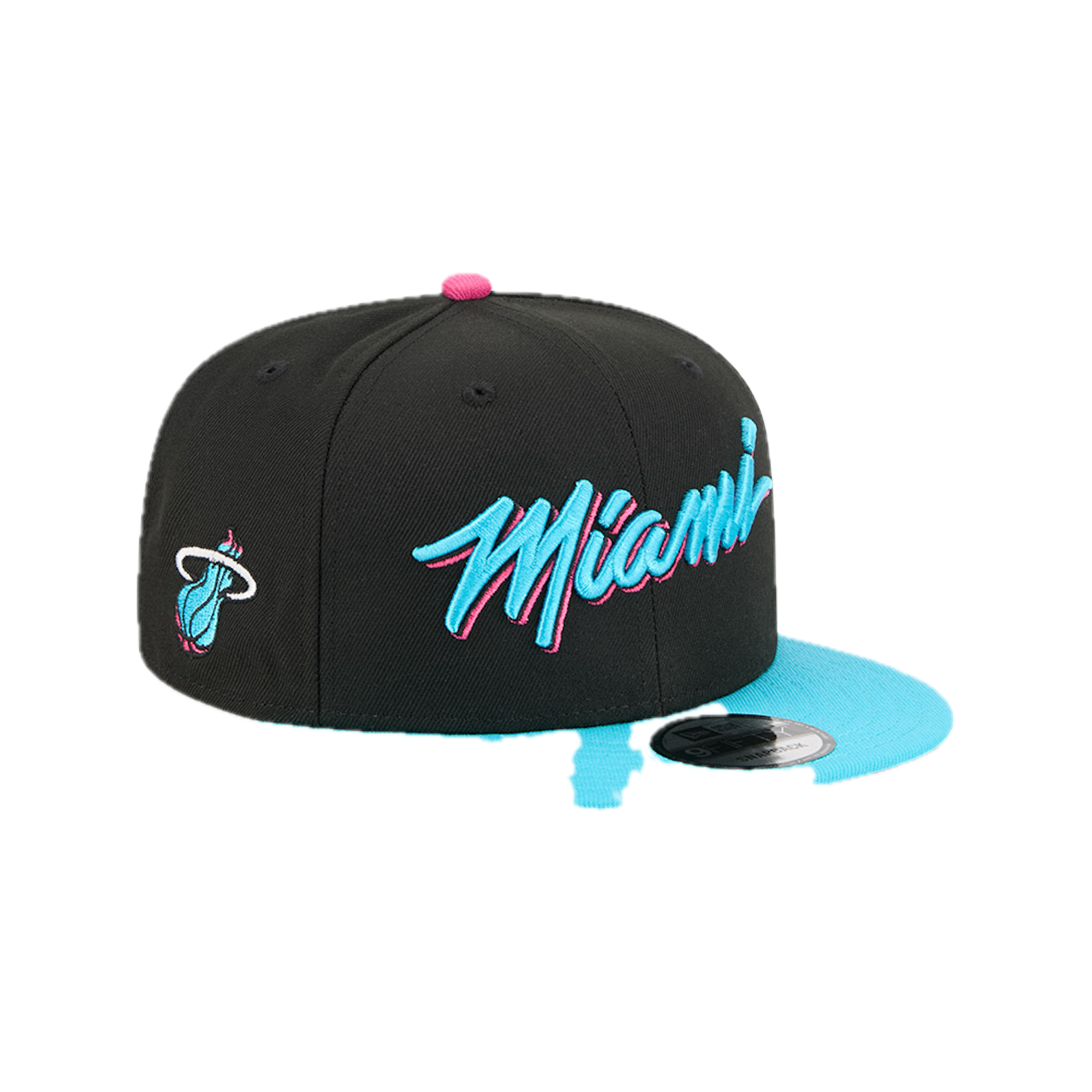 This New Era 9FIFTY Miami Heat flat cap from the 2025 NBA City Edition collection features the Heat's city name embroidered on the front panels, the team logo on the right side, the NBA logo on the back, and the New Era flag embroidered on the left side.