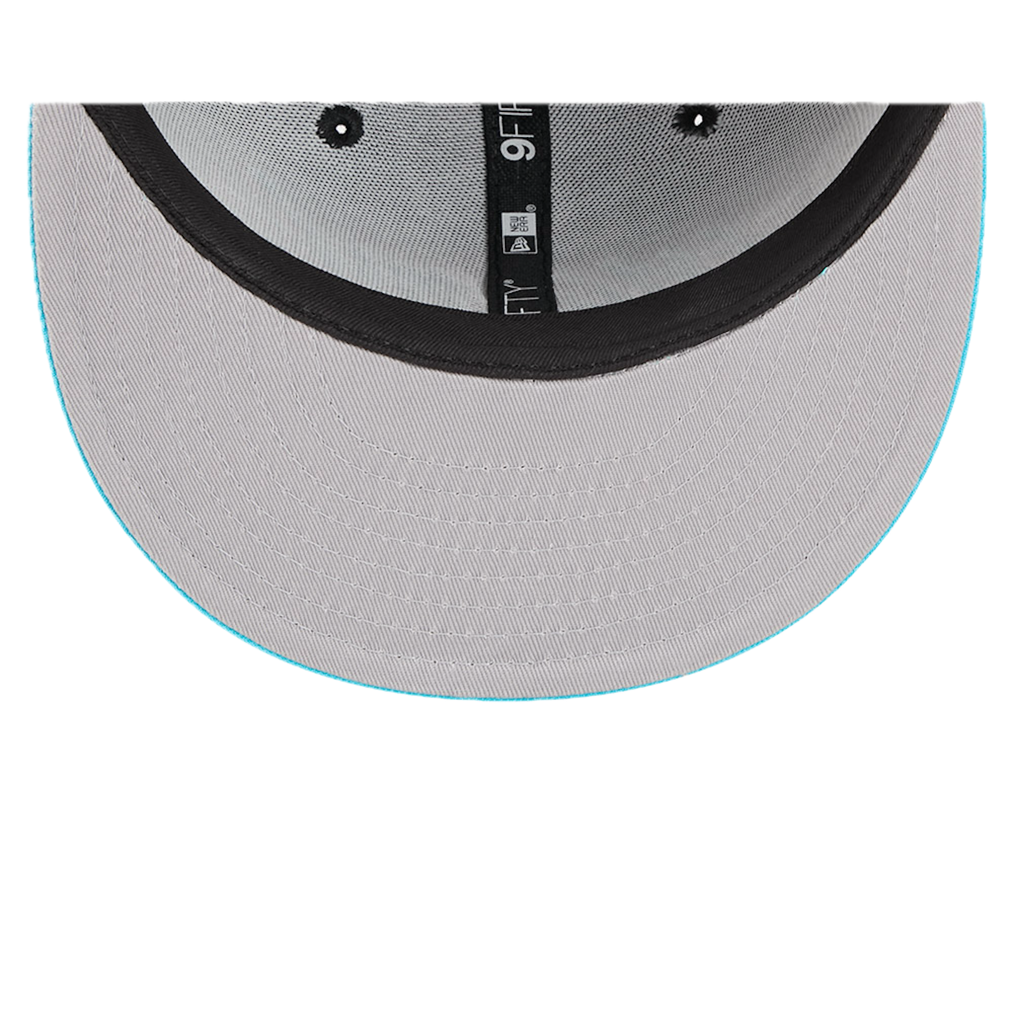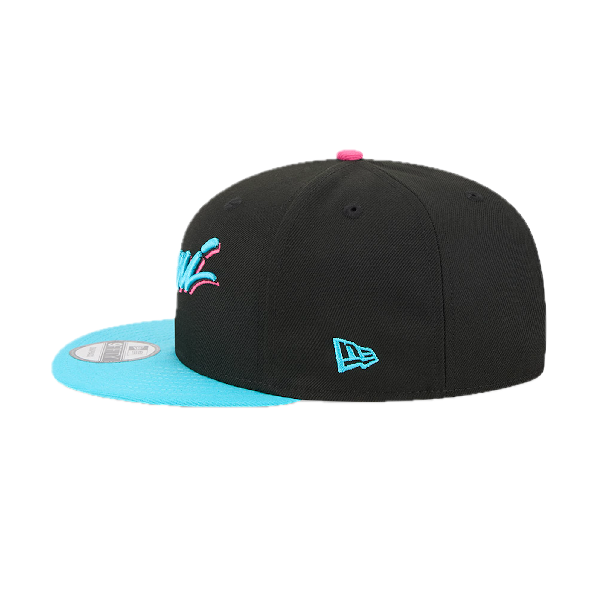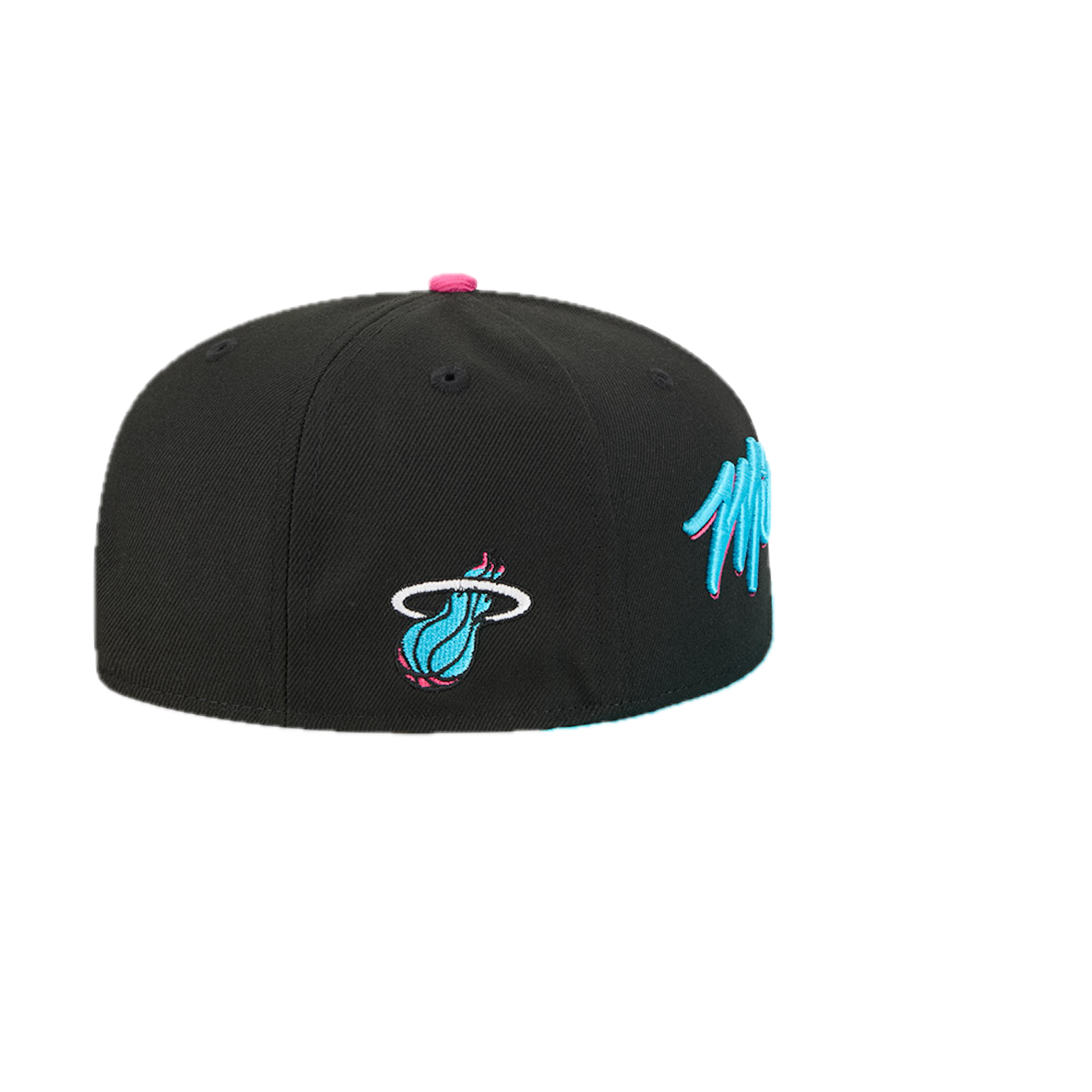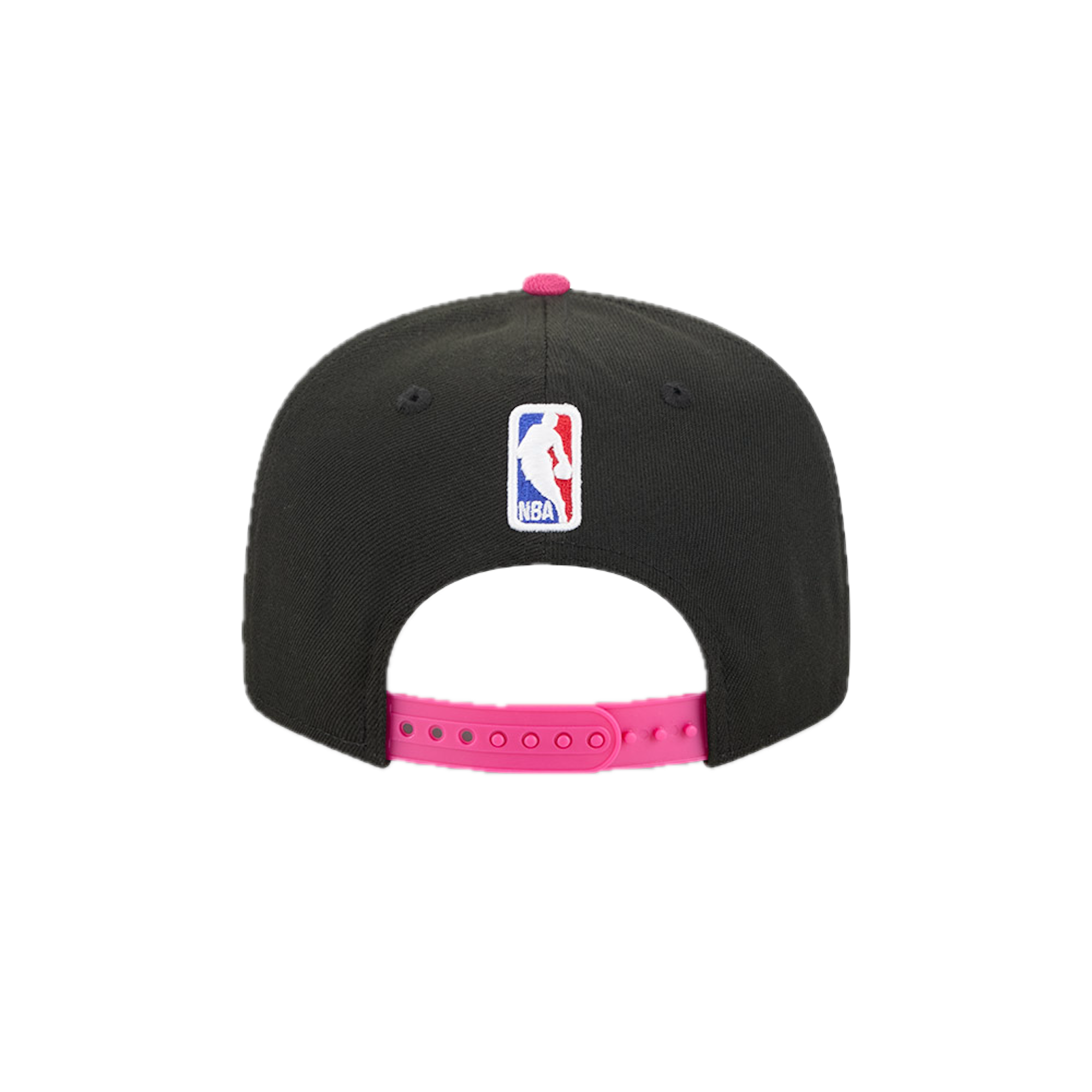This New Era 9FIFTY Miami Heat flat cap from the 2025 NBA City Edition collection features the Heat's city name embroidered on the front panels, the team logo on the right side, the NBA logo on the back, and the New Era flag embroidered on the left side.