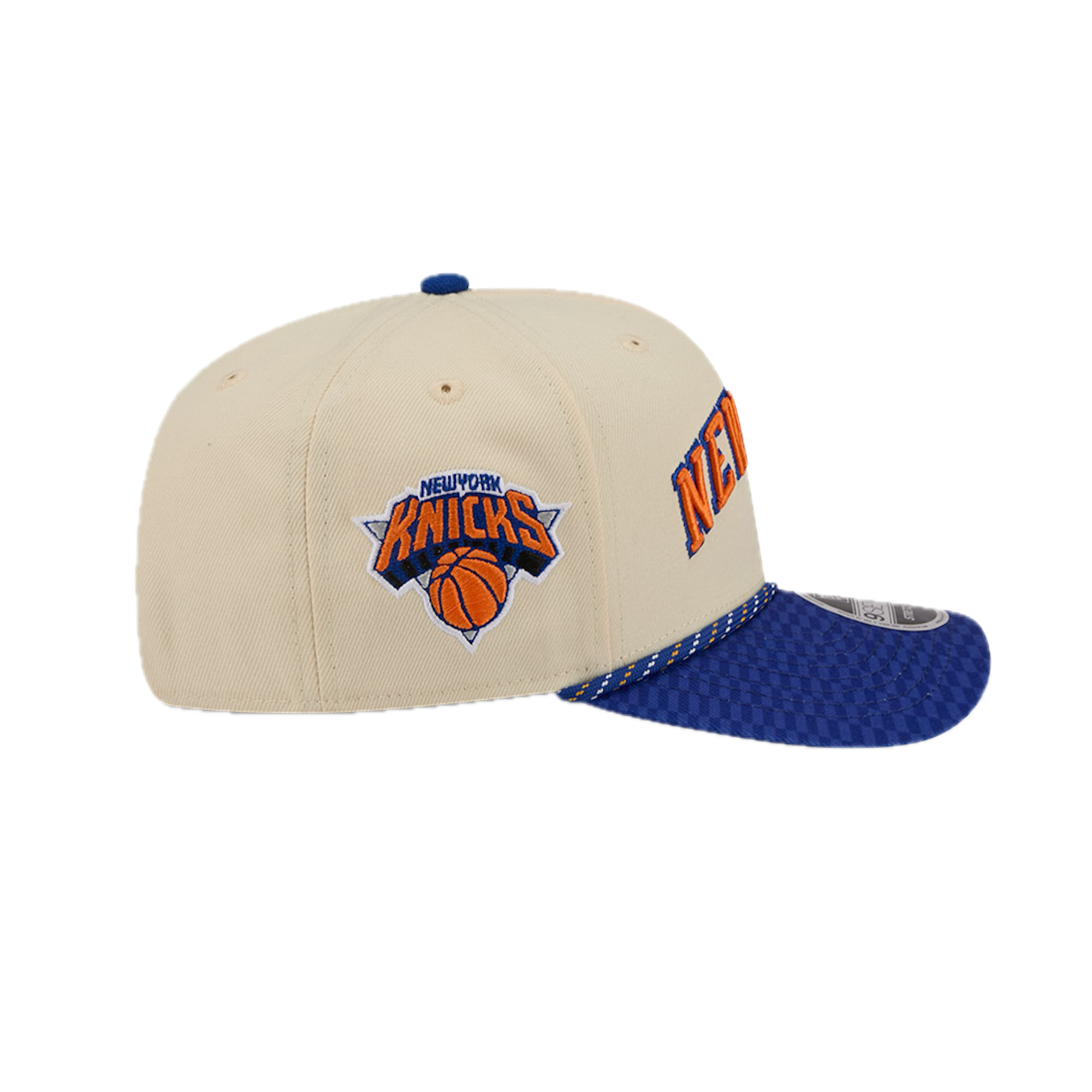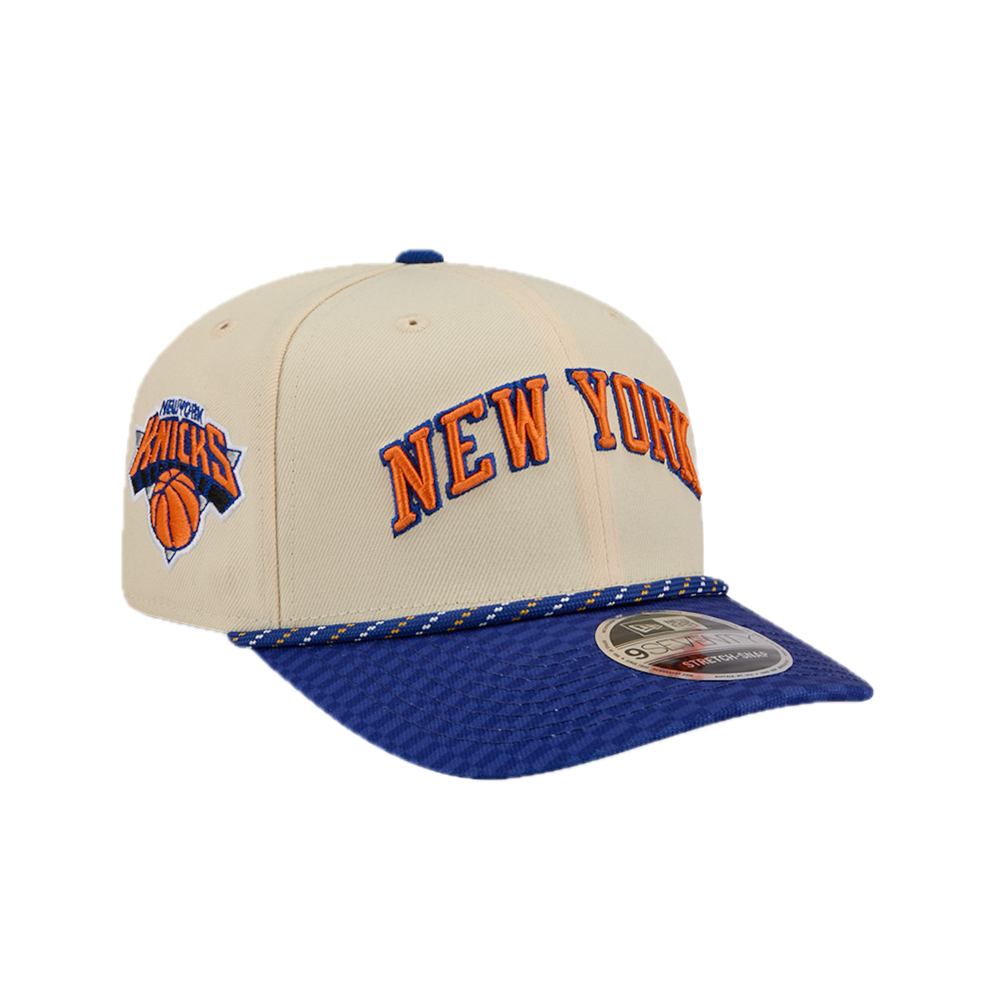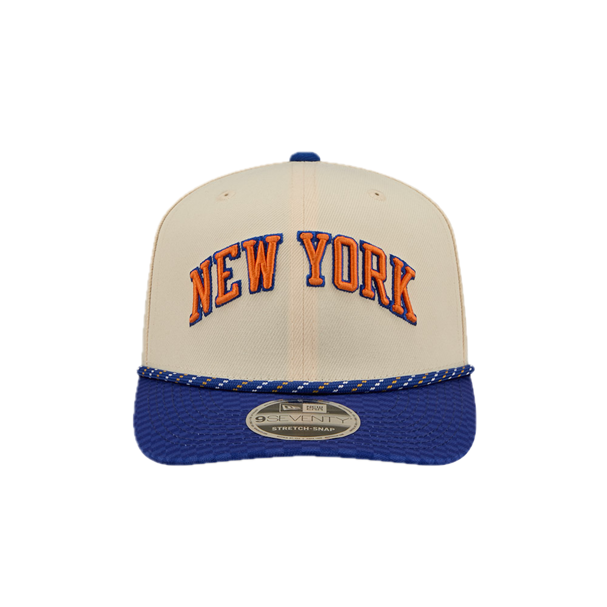 The New York Knicks 2025 City Edition 9SEVENTY Stretch-Snap features an embroidered Knicks City Edition logo at the front panels with a logo at the right-wear side and a rope at the visor. Additional details include the NBA Logoman above an adjustable stretch-snap closure at the rear and a gray undervisor.