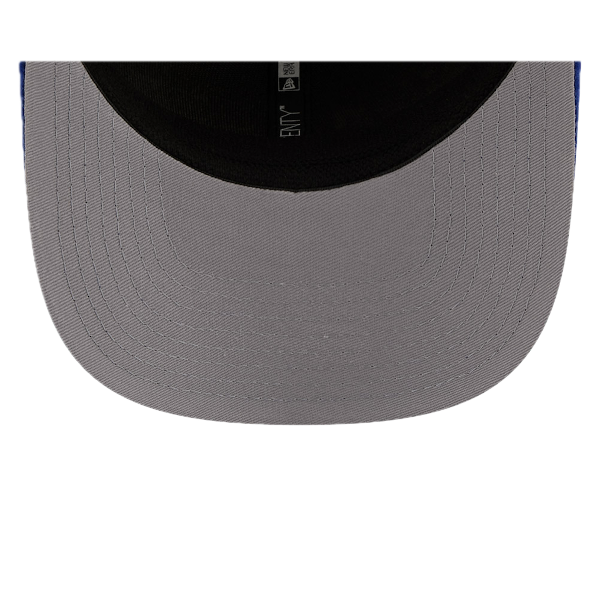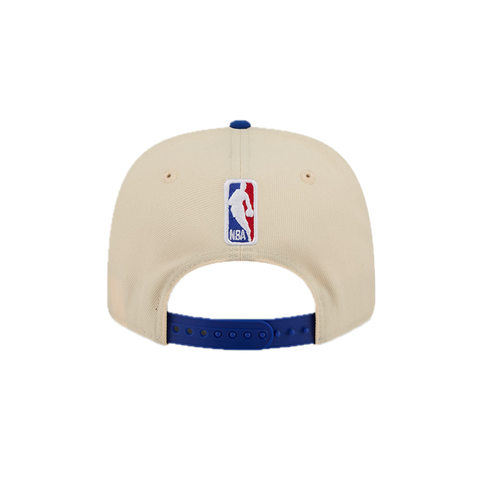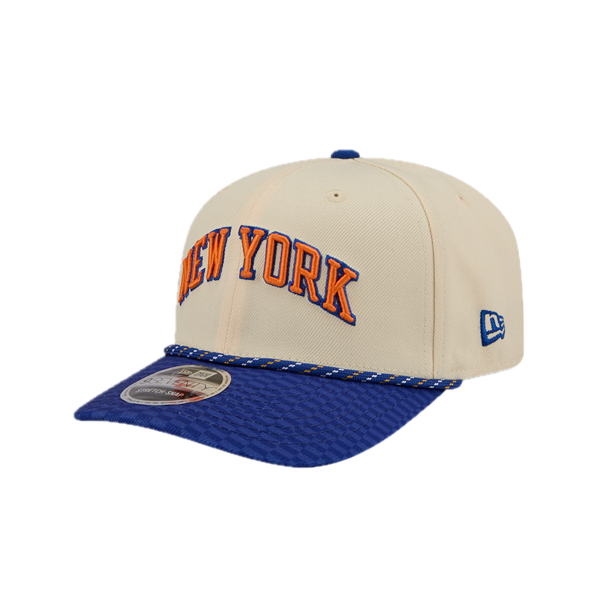 The New York Knicks 2025 City Edition 9SEVENTY Stretch-Snap features an embroidered Knicks City Edition logo at the front panels with a logo at the right-wear side and a rope at the visor. Additional details include the NBA Logoman above an adjustable stretch-snap closure at the rear and a gray undervisor.