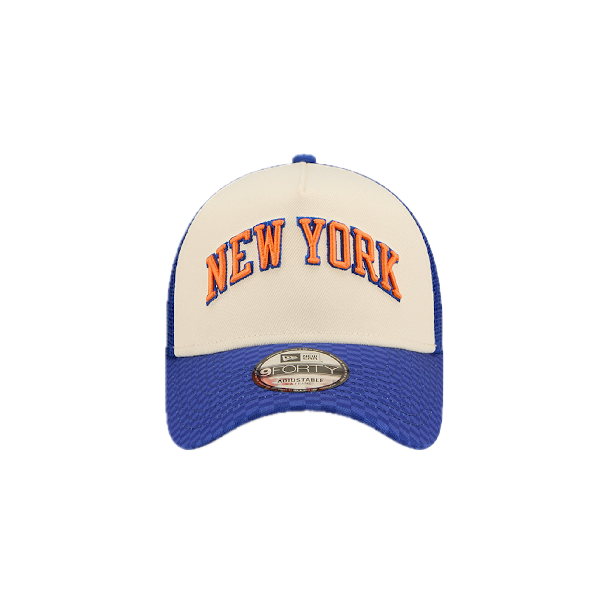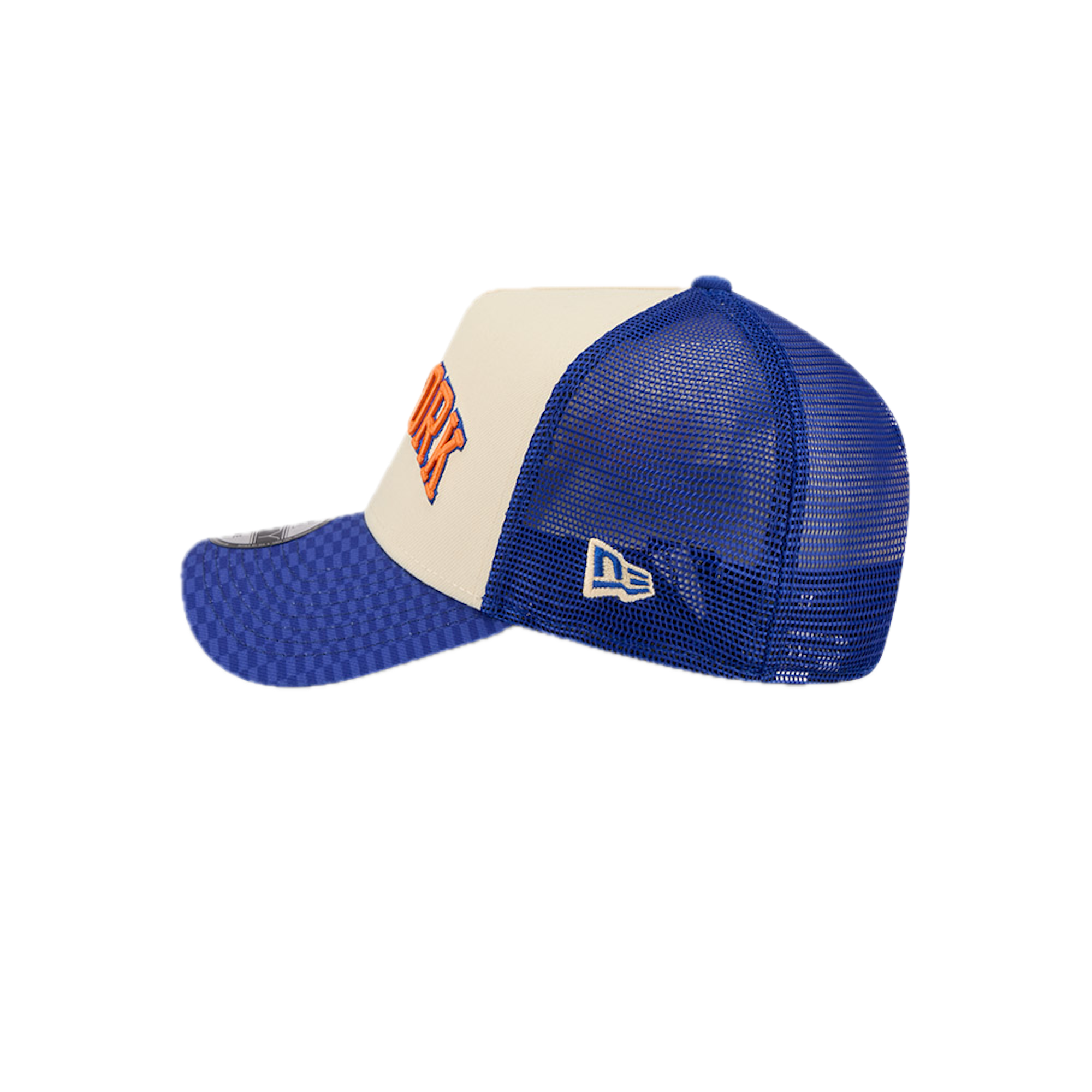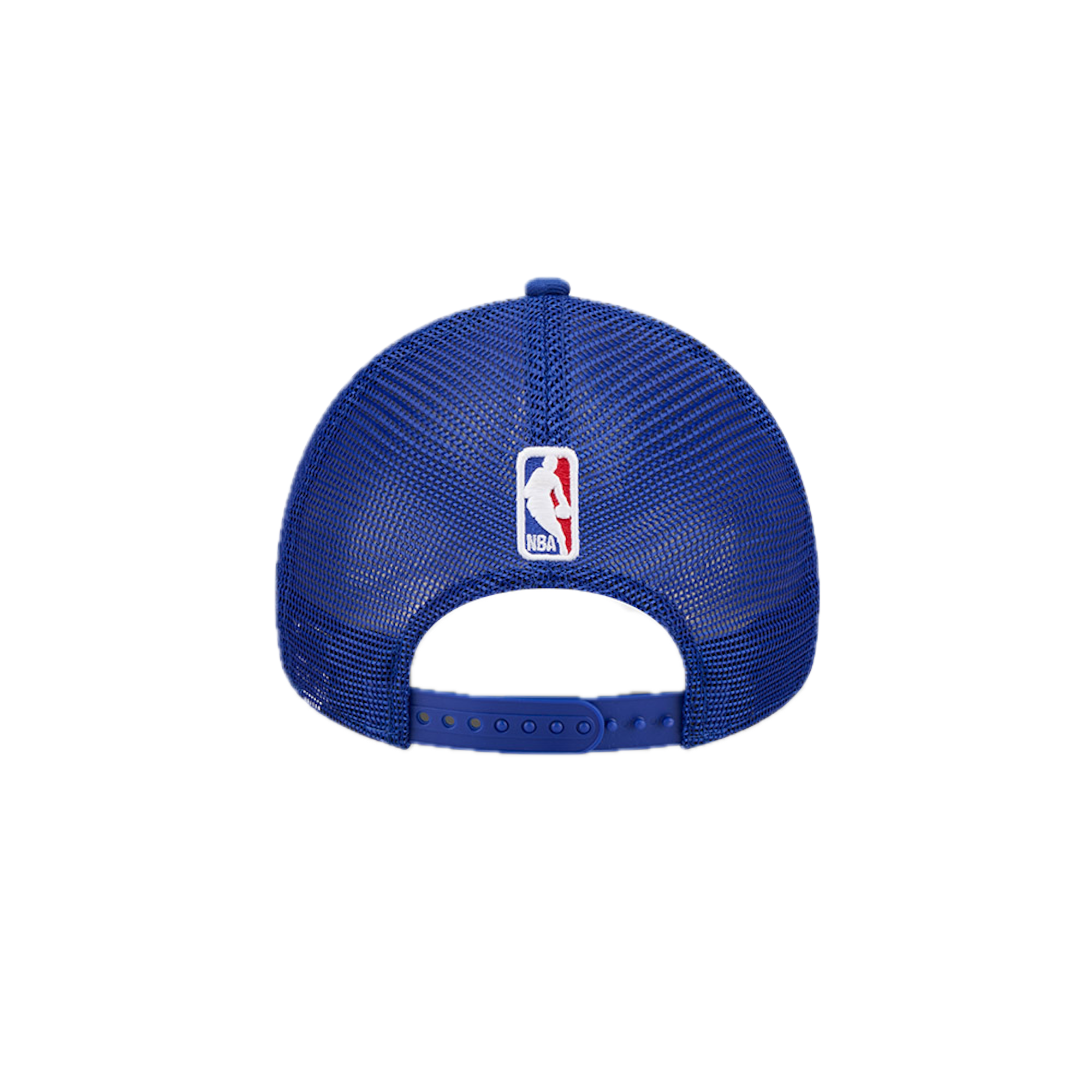The Boston Celtics NBA City Edition '25 9FORTY A-Frame Trucker features an embroidered flat City Edition Celtics logo on high-profile pinched cotton front panels, tonal polyester mesh side and back panels with a contrast visor, team logo patch detail on the side, and an league logo at the back above an adjustable snapback enclosure.