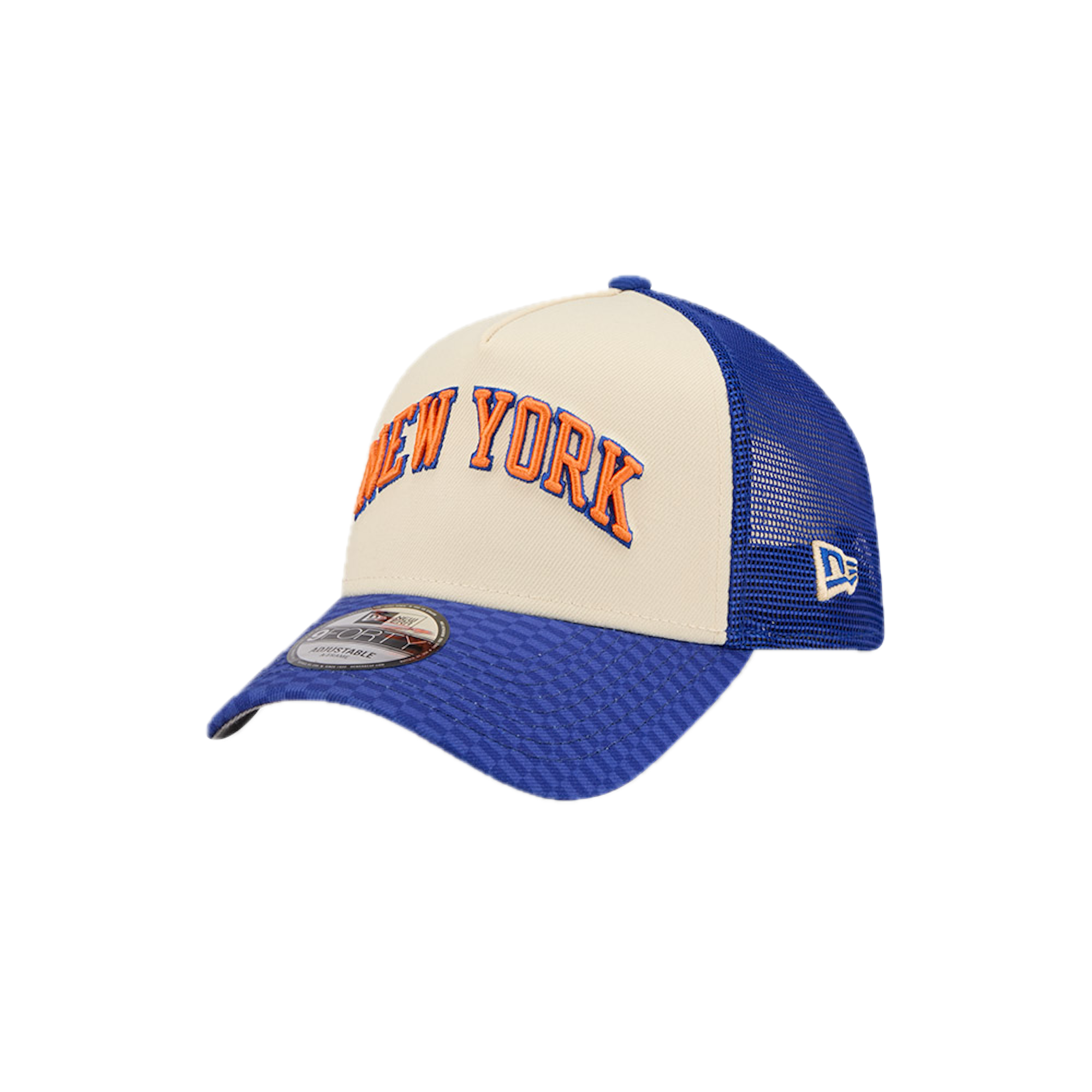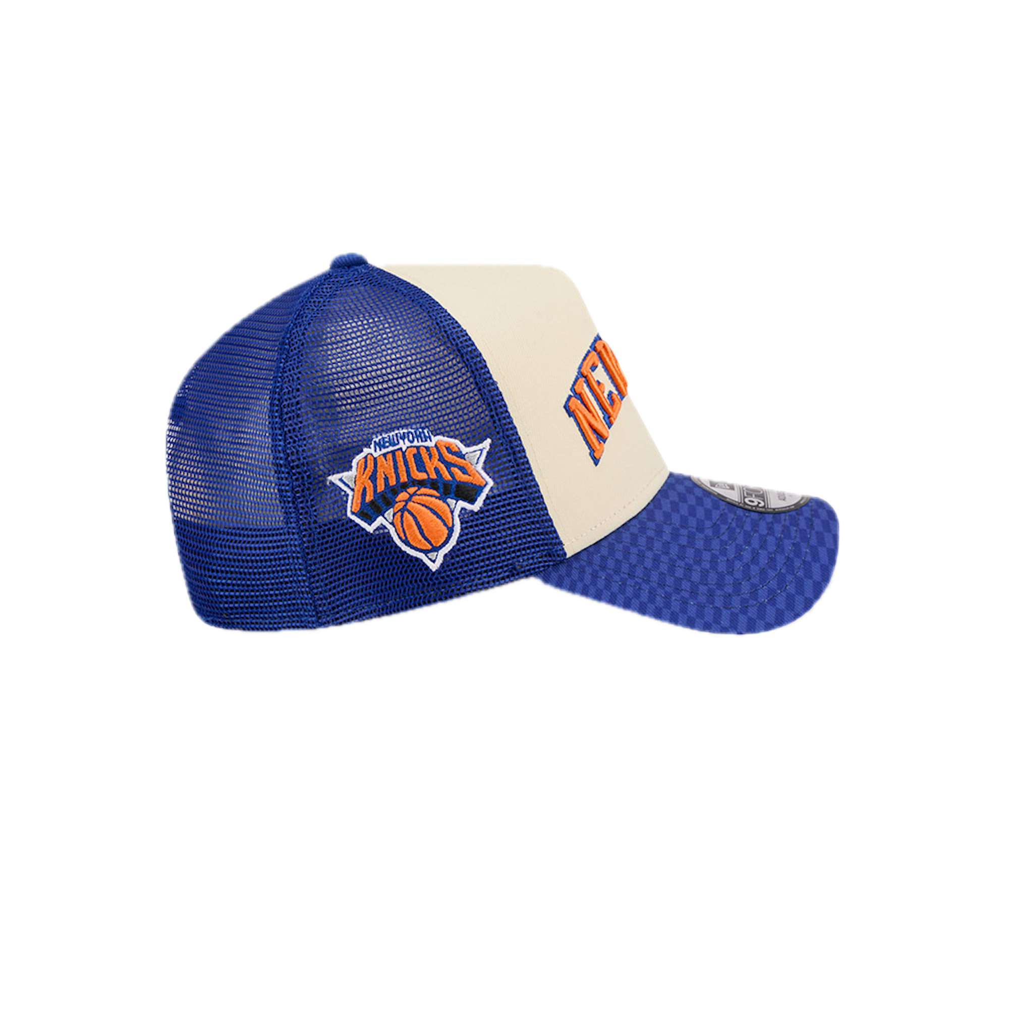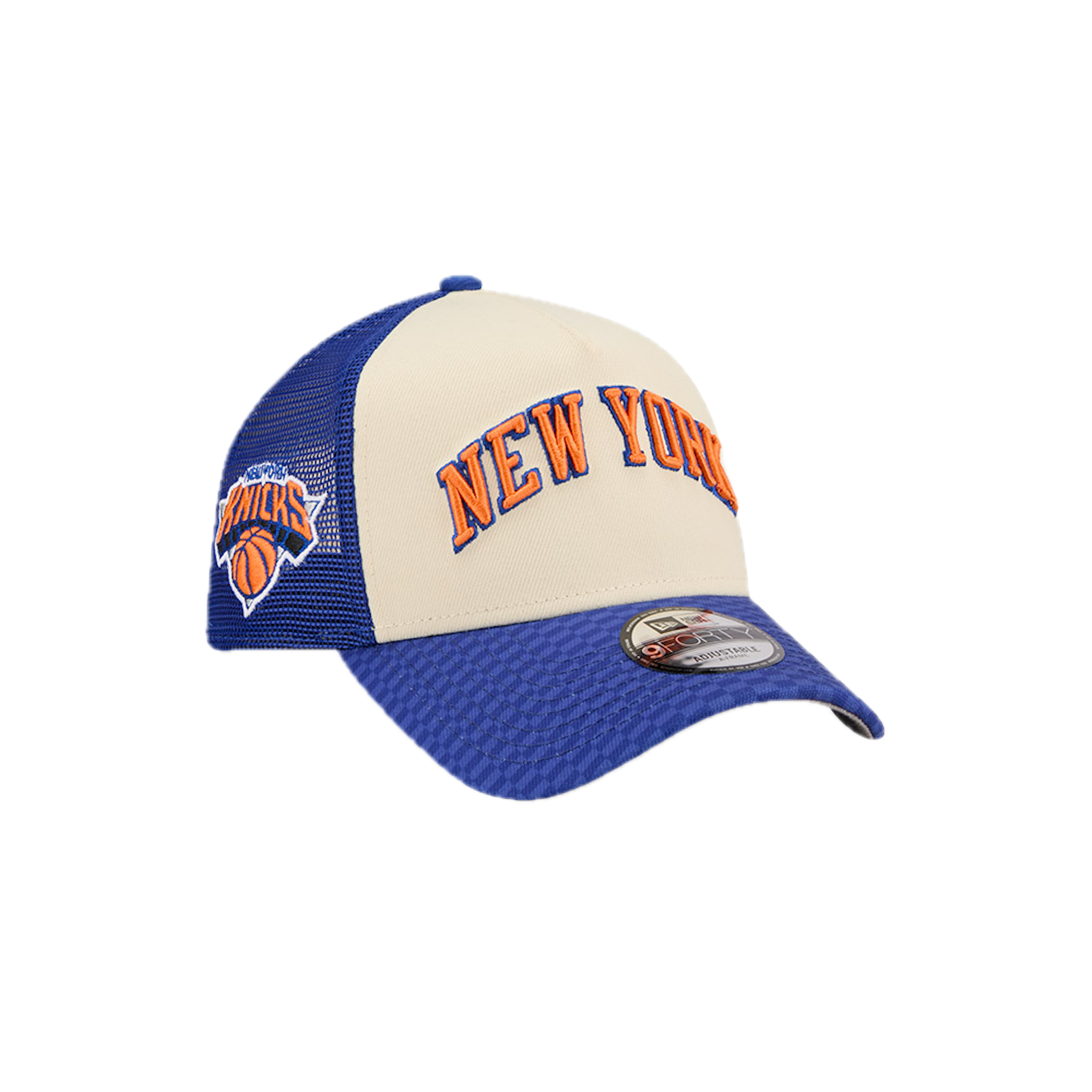 The Boston Celtics NBA City Edition '25 9FORTY A-Frame Trucker features an embroidered flat City Edition Celtics logo on high-profile pinched cotton front panels, tonal polyester mesh side and back panels with a contrast visor, team logo patch detail on the side, and an league logo at the back above an adjustable snapback enclosure.