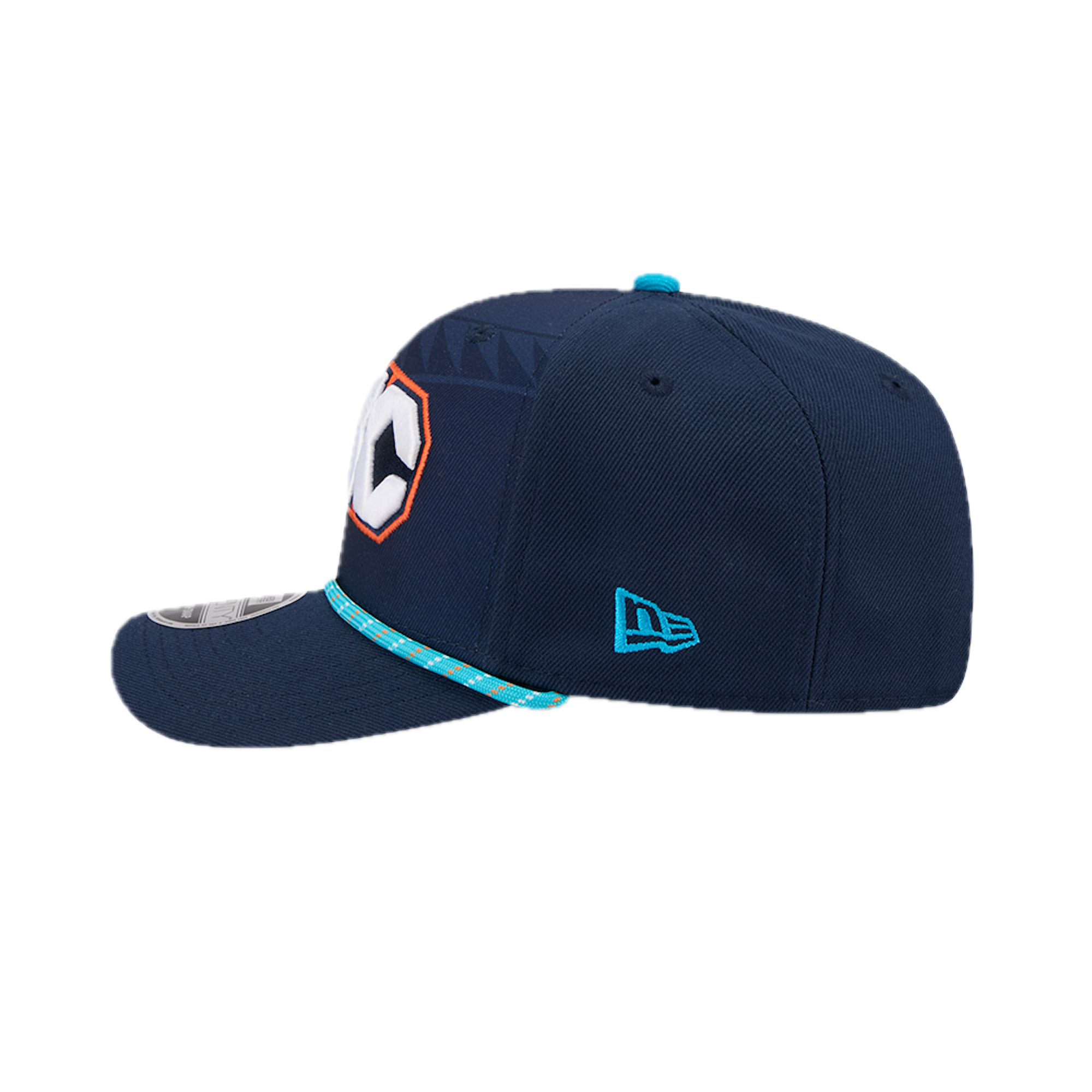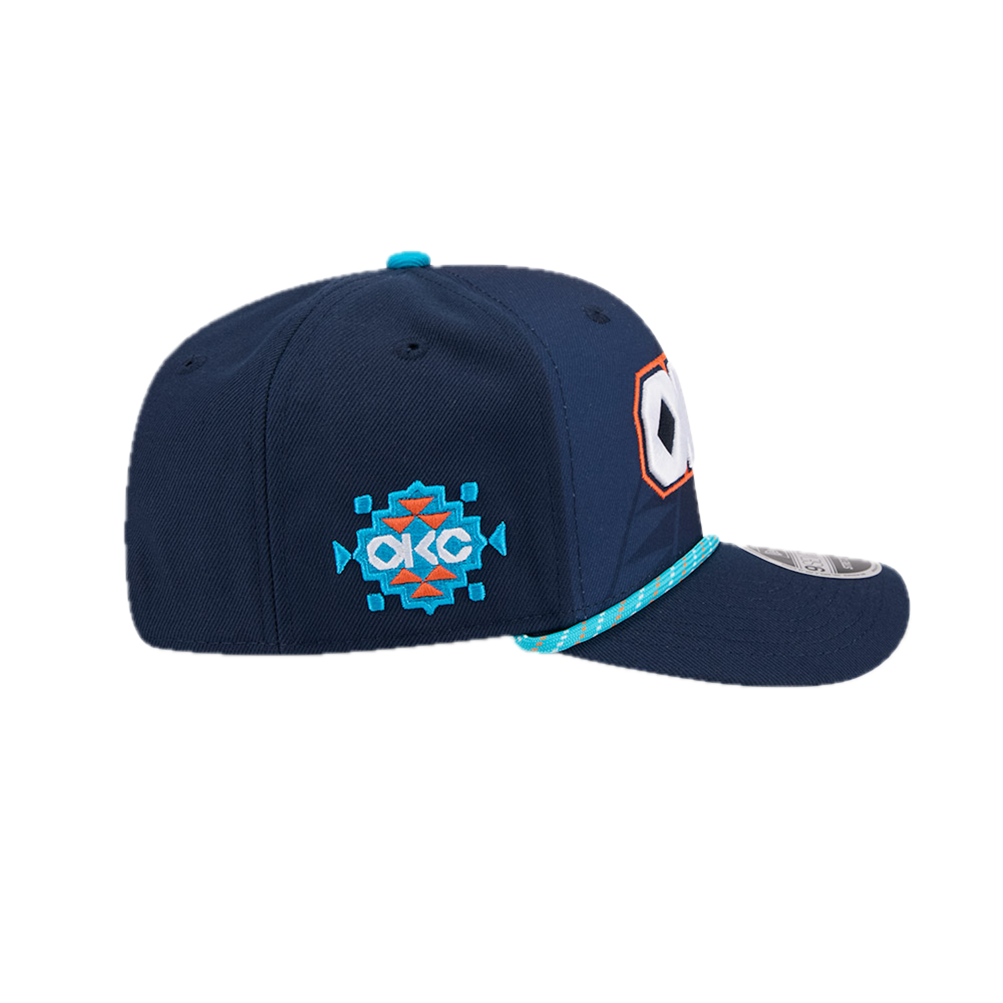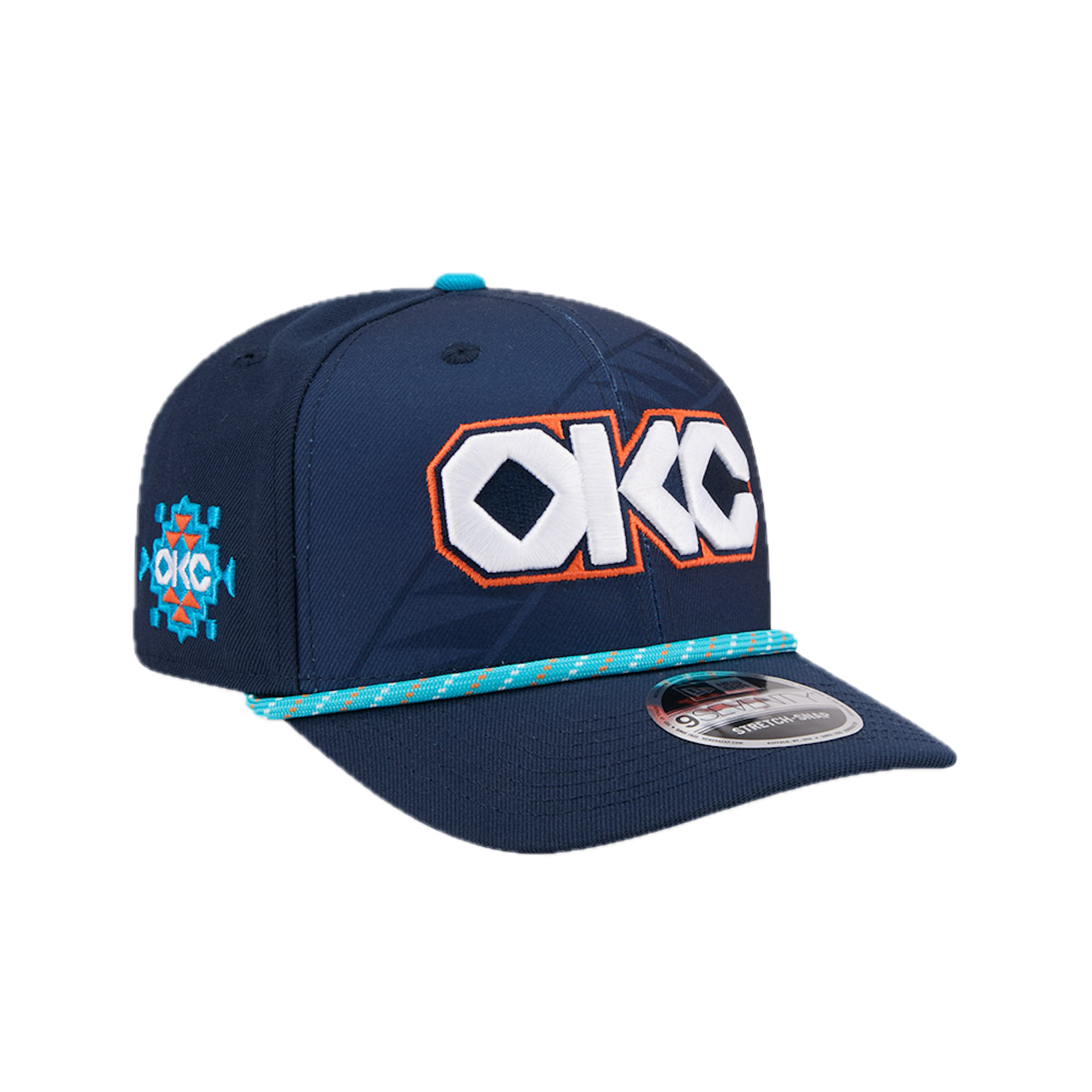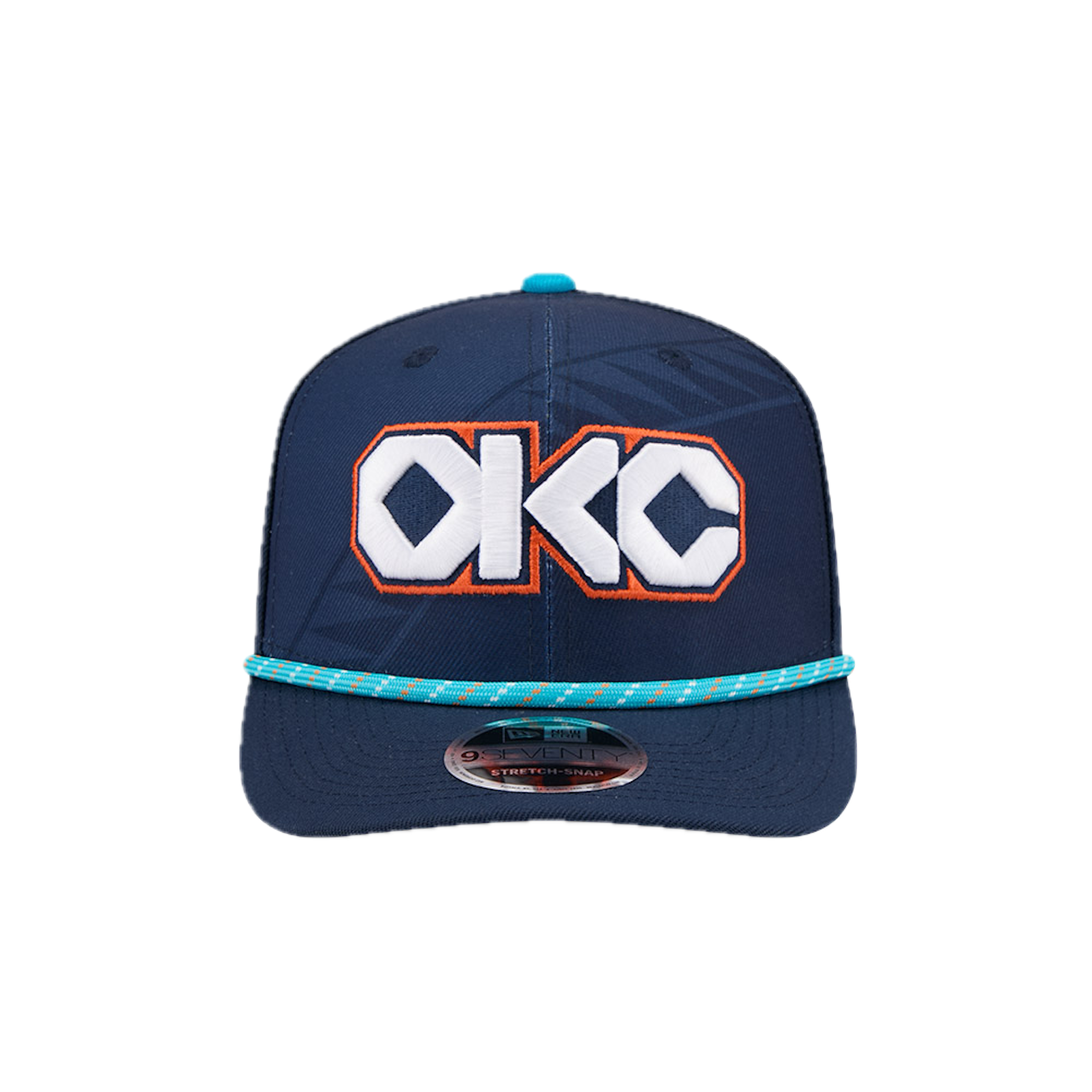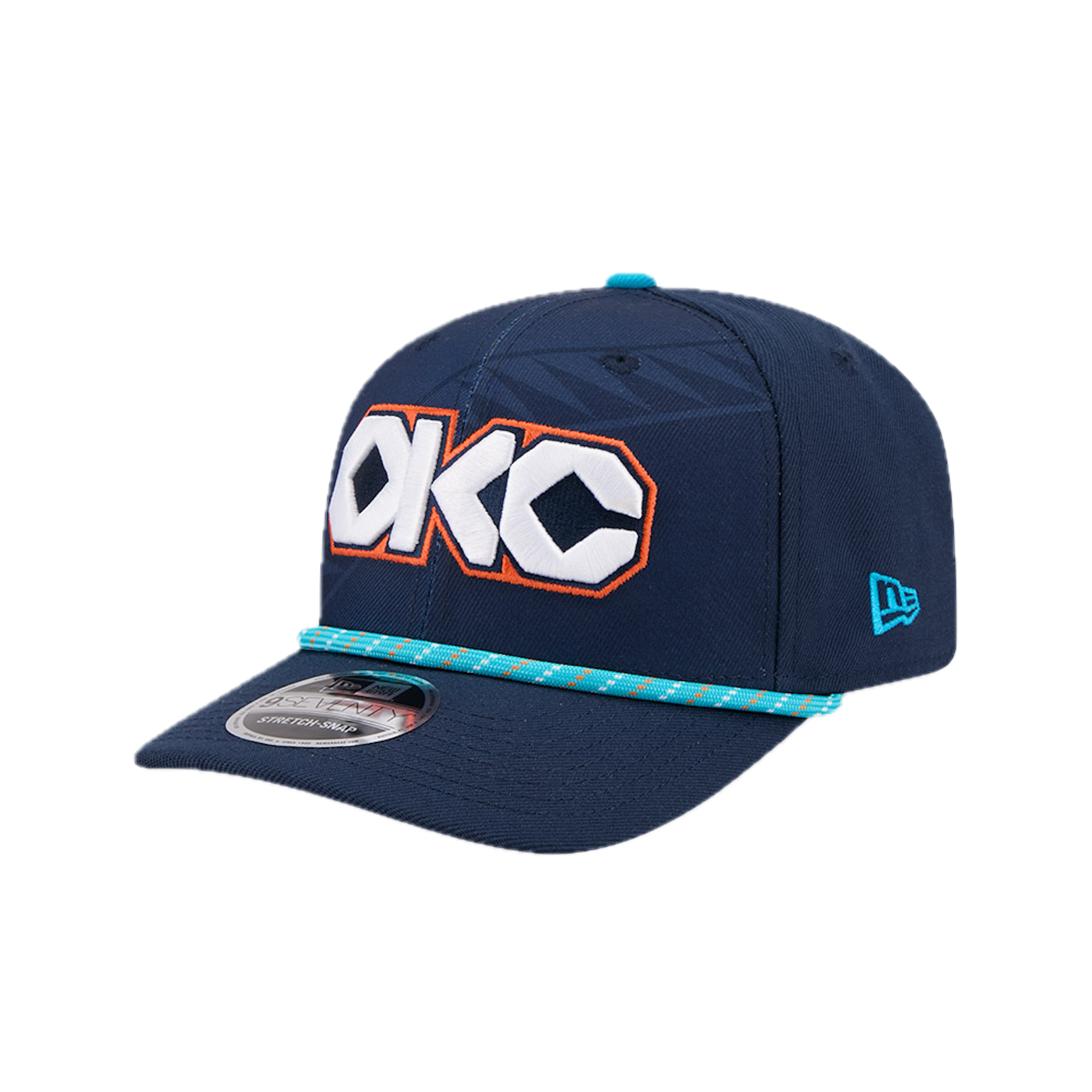 The Oklahoma City Thunder 2025 City Edition 9SEVENTY Stretch-Snap features an embroidered Thunder City Edition logo at the front panels with a logo at the right-wear side and a rope at the visor. Additional details include the NBA Logoman above an adjustable stretch-snap closure at the rear and a gray undervisor.