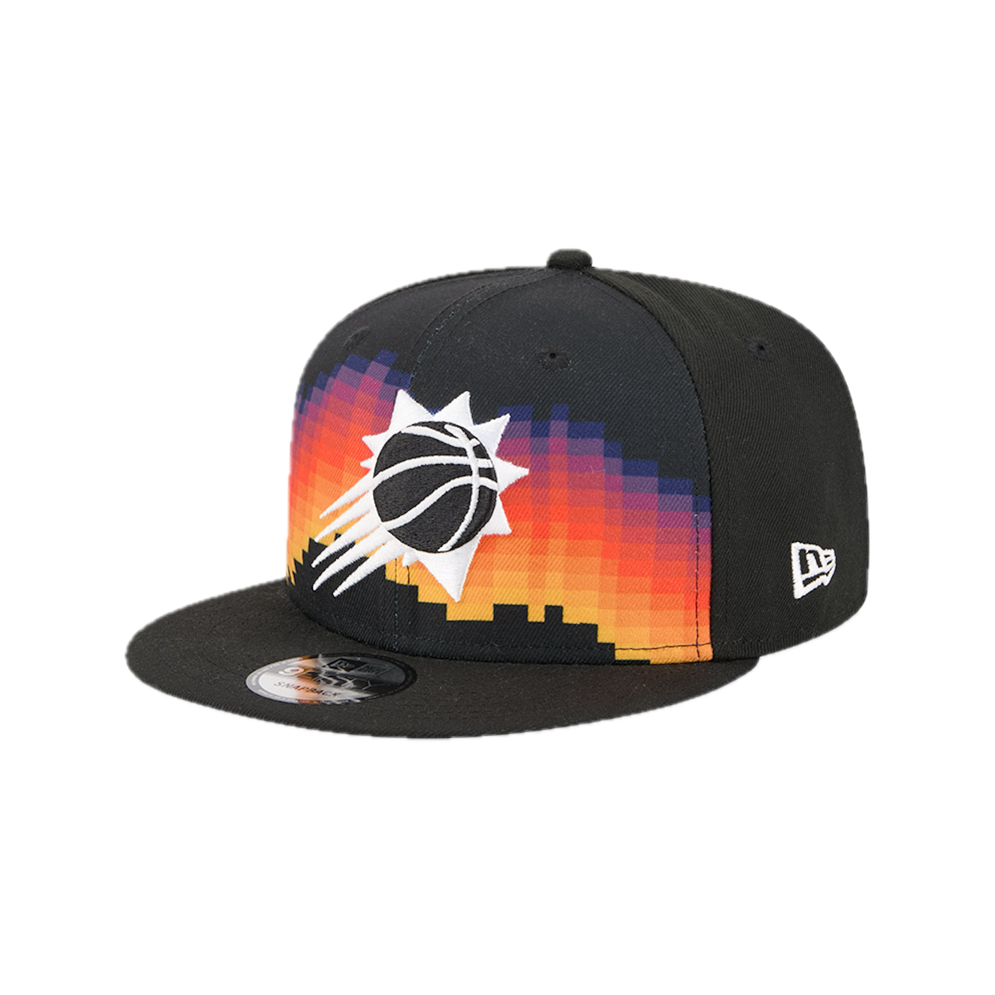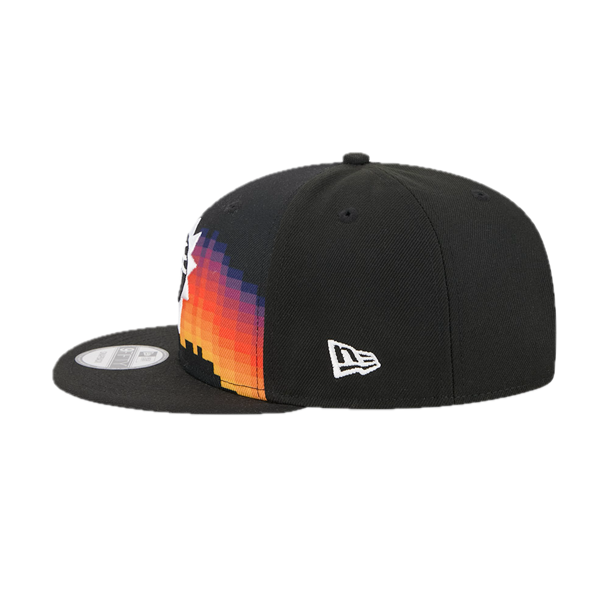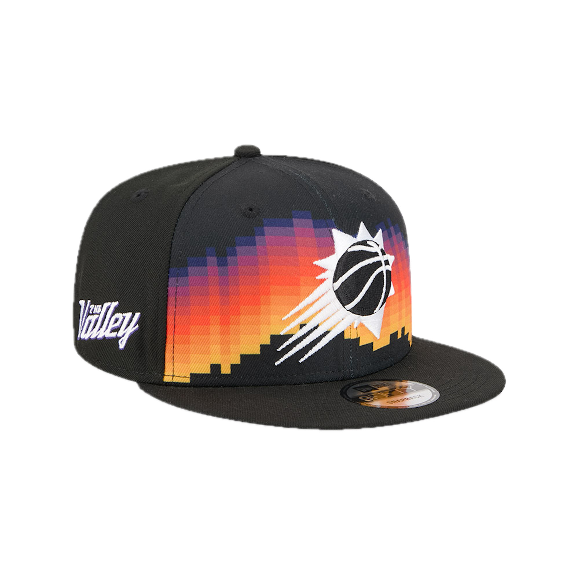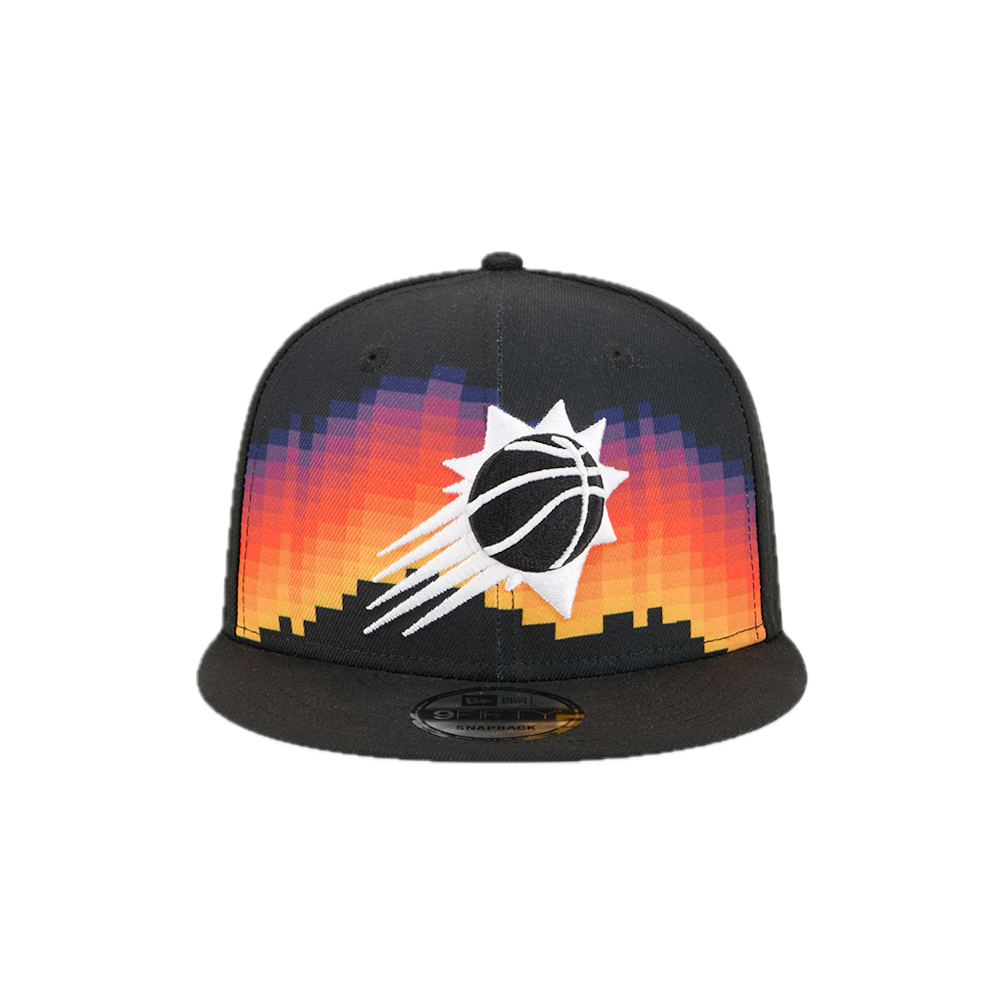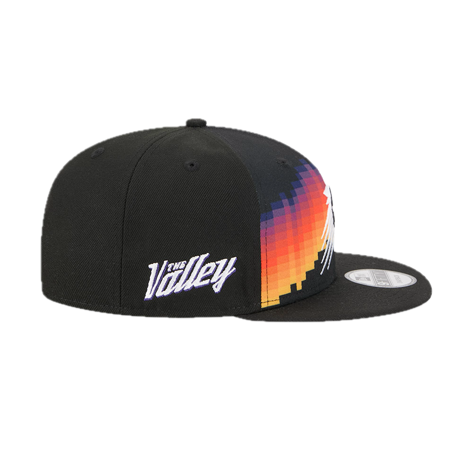 This New Era 9FIFTY Phoenix Suns flat cap from the 2025 NBA City Edition features the Suns logo embroidered on the front panels, the team's city name on the right side, the NBA logo on the back, and the New Era flag embroidered on the left side. Buy it now.